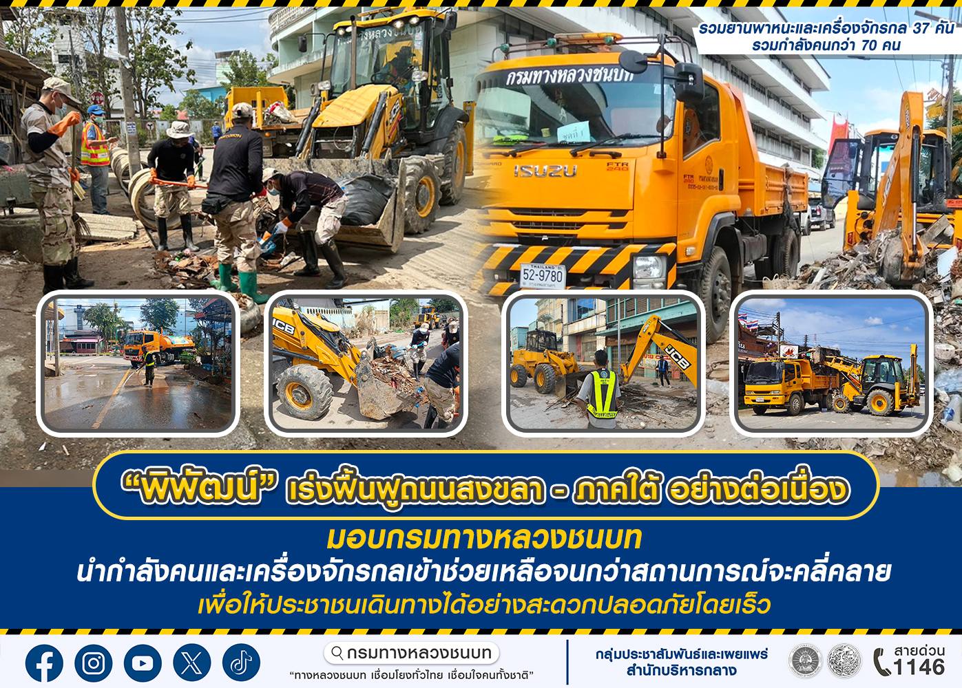 โดย ทช. ได้รวมกำลังจากสำนักงานทางหลวงชนบทในพื้นที่ภาคใต้ ประกอบด้วย สำนักงานทางหลวงชนบทที่ 4 (เพชรบุรี), สำนักงานทางหลวงชนบทที่ 11 (สุราษฎร์ธานี), สำนักงานทางหลวงชนบทที่ 12 (สงขลา), สำนักงานทางหลวงชนบทที่ 14 (กระบี่) ตลอดจนสำนักเครื่องกลและสื่อสาร, สำนักบำรุงทาง เข้าร่วมในการปฏิบัติภารกิจเพื่อฟื้นฟูเส้นทางในจังหวัดสงขลา ลงพื้นที่ฉีดล้างทำความสะอาดถนน บ้านเรือน พร้อมแจกจ่ายน้ำให้กับผู้ประสบภัย เป็นการบรรเทาความเดือดร้อนให้ประชาชนสามารถดำรงชีวิตได้อย่างปกติสุขโดยเร็วต่อไป ทั้งนี้ หากประชาชนต้องการแจ้งเหตุหรือขอความช่วยเหลือสามารถติดต่อสายด่วน 1146 ตลอด 24 ชั่วโมง