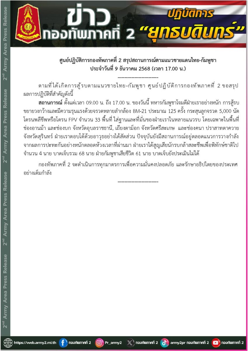 ศูนย์ปฏิบัติการกองทัพภาคที่ 2 สรุปสถานการณ์ตามแนวชายแดนไทย-กัมพูชา ประจำวันที่ 9 ธันวาคม 2568 (เวลา 17.00 น.)