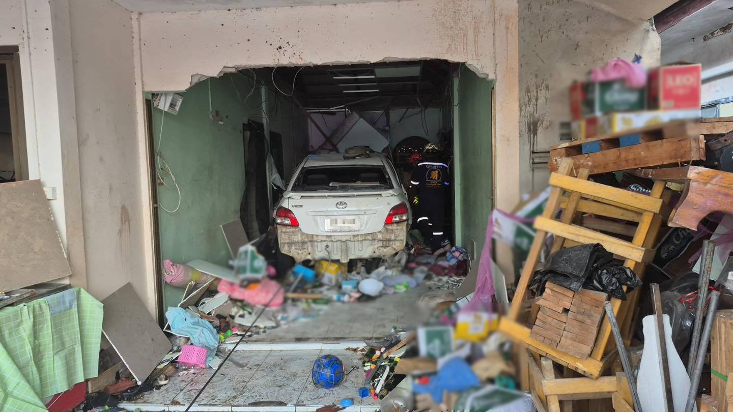 หนุ่มขับเก๋งเสียหลักพุ่งชนประตูรั้ว ทะลุเข้าบ้าน กำแพงทรุดตัว ทับร่างเมืยเจ้าของบ้านได้รับบาดเจ็บคาห้องน้ำ จ.ชลบุรี