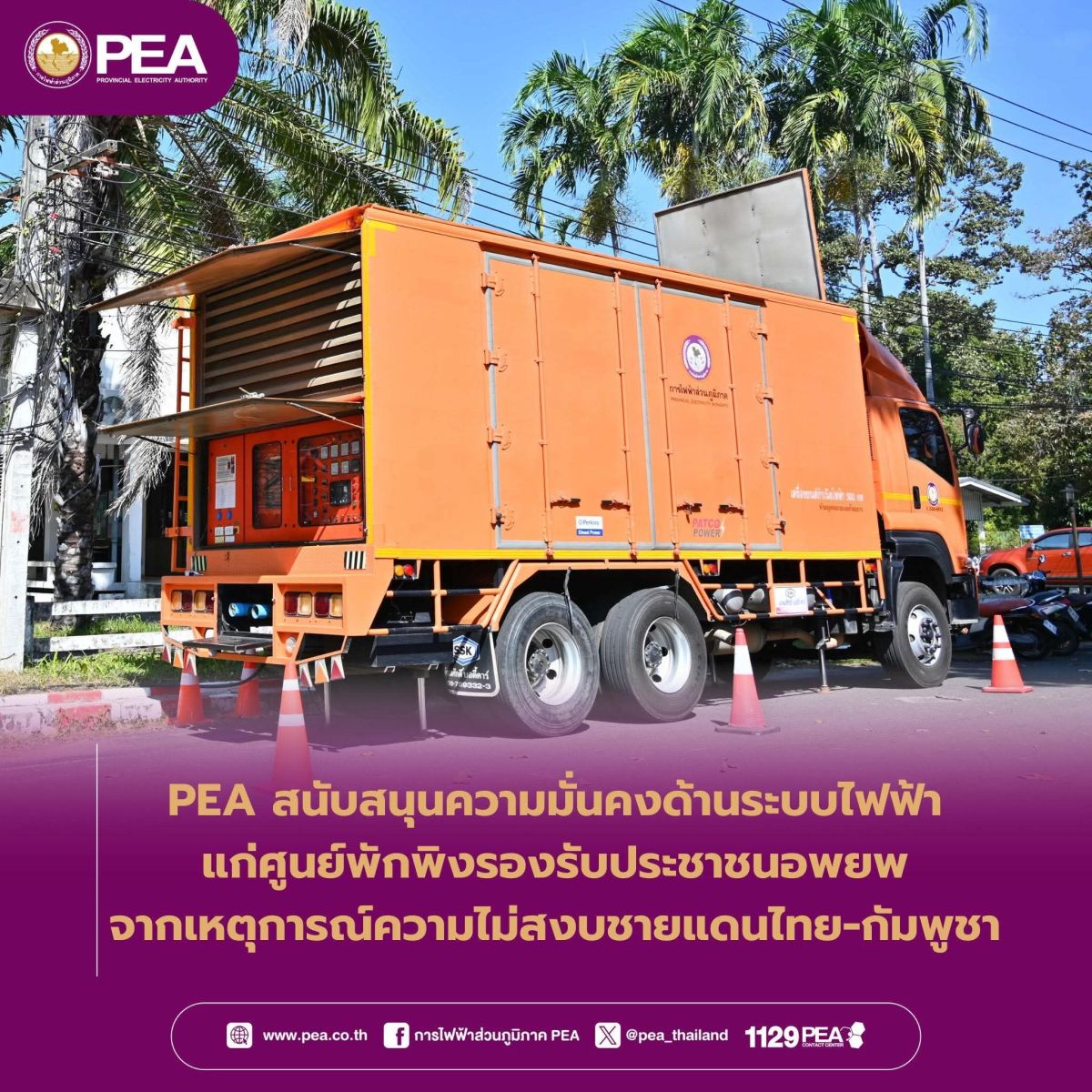 การไฟฟ้าส่วนภูมิภาค (PEA) แสดงความห่วงใยต่อประชาชนในพื้นที่ชายแดนไทย–กัมพูชา หลังได้รับผลกระทบจากสถานการณ์บริเวณชายแดนในช่วงที่ผ่านมา โดยได้ลงพื้นที่เพื่อเสริมความมั่นคงด้านระบบไฟฟ้า ให้ศูนย์พักพิงเพื่อรองรับประชาชนที่ต้องอพยพออกจากพื้นที่เสี่ยงได้มีไฟฟ้าใช้อย่างปลอดภัยและต่อเนื่อง