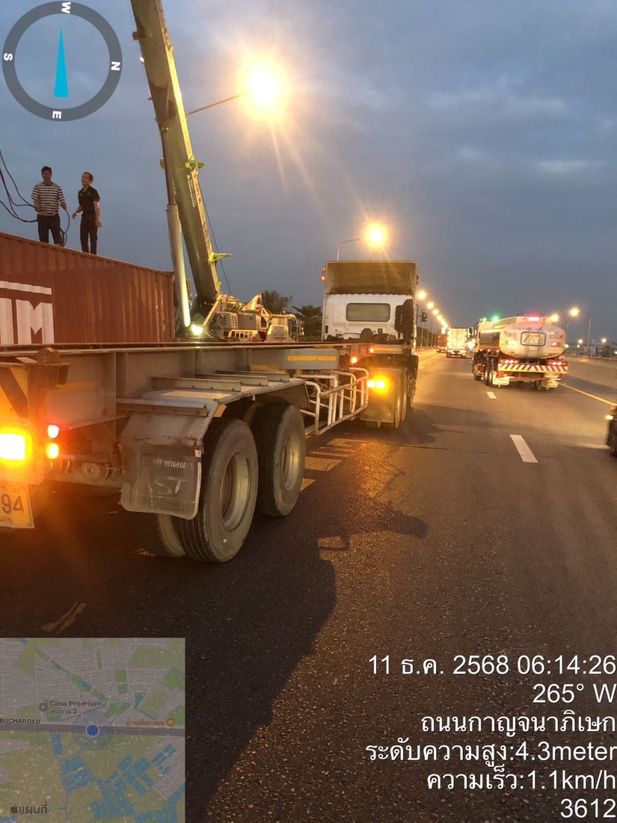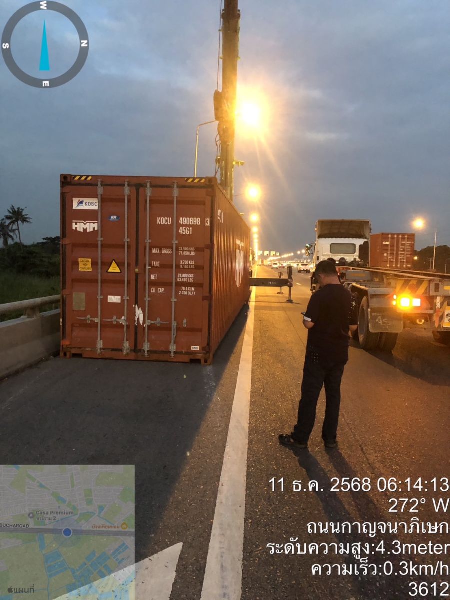 06.35 น. ก่อนหน้านี้ มีเหตุ รถบรรทุกตู้คอนเทนเนอร์ ชนขอบทาง ตู้หลุด ขวางการจราจร บนทางพิเศษกาญจนาภิเษก (บางพลี-สุขสวัสดิ์) กม.8+200A มุ่งหน้าบางขุนเทียน