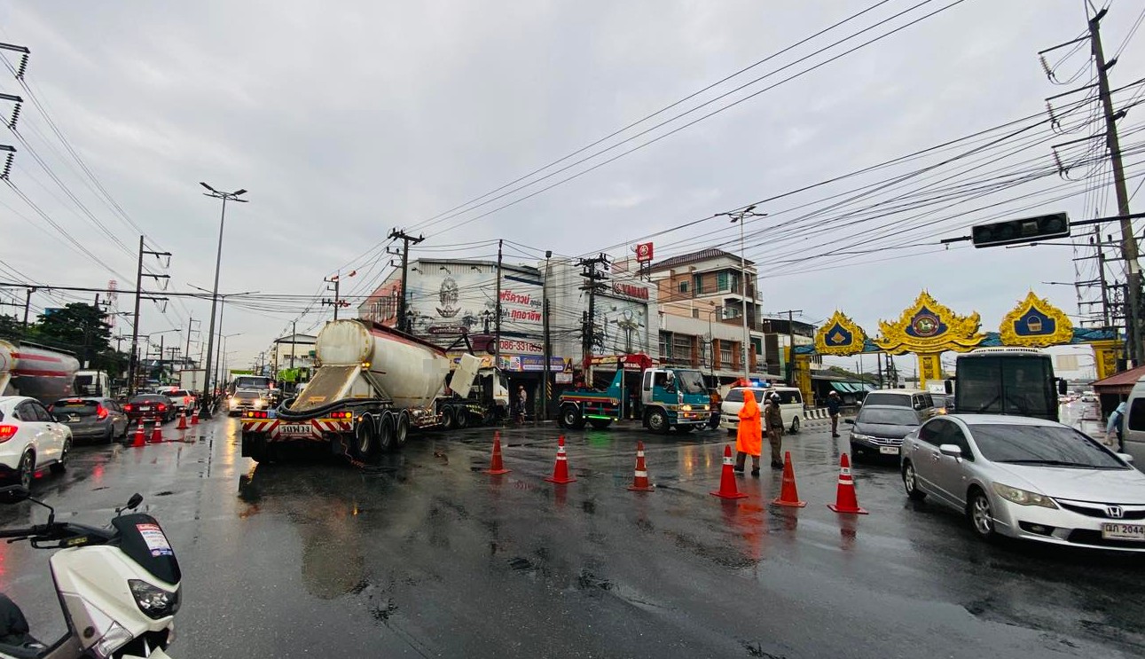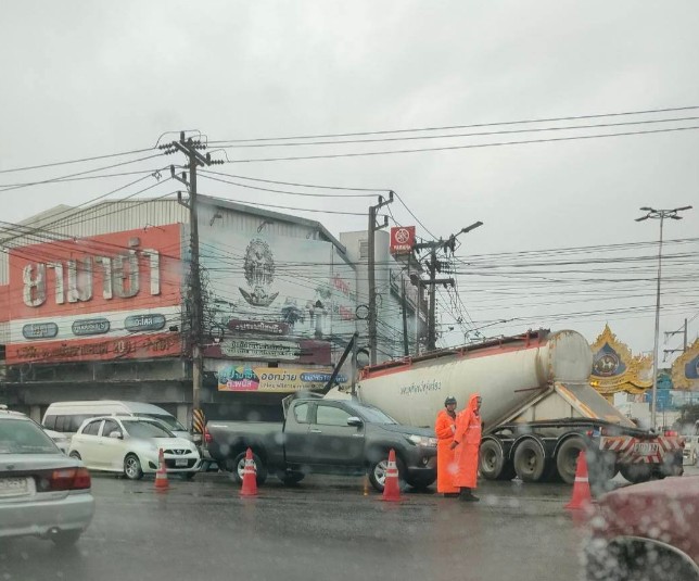 07.20 น. รถยกและการไฟฟ้าส่วนภูมิภาคอำเภอพนัสนิคม เจ้าหน้าที่จราจรสถานีตำรวจภูธรพนัสนิคม และอาสาสมัครกู้ภัยสว่างเหตุสงเคราะห์ภัย ทุ่งเหียง ช่วยอำนวยการจราจรช่วงสี่แยกไฟแดงศุขประยูร ขณะนี้รถยกอยู่ระหว่างดำเนินการนำรถ 18 ล้อออกจาก ช่องทางเดินรถ ในพื้นที่ถนนเปียกลื่นโปรดขับขี่ด้วยความระมัดระวัง รถติดมาก