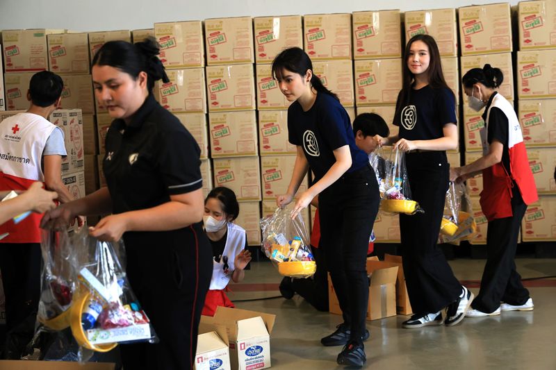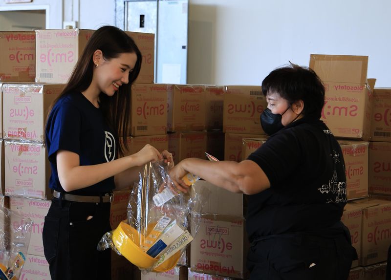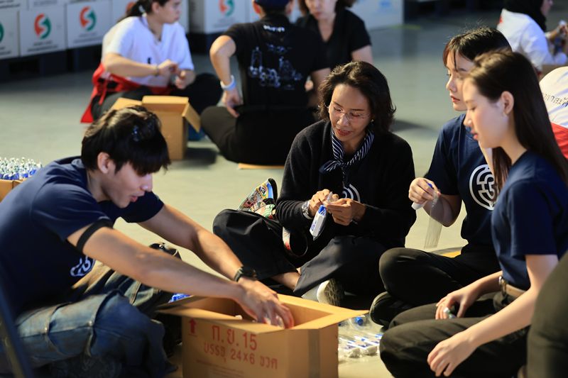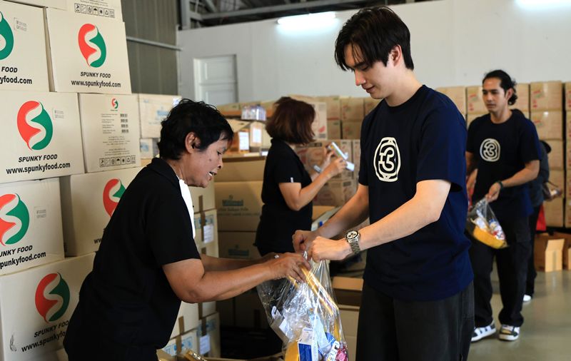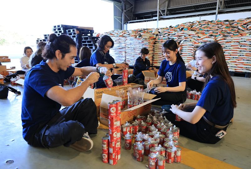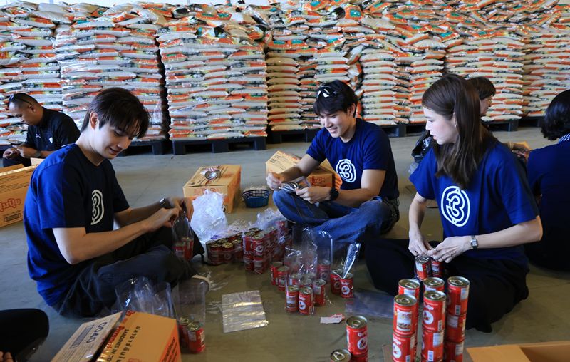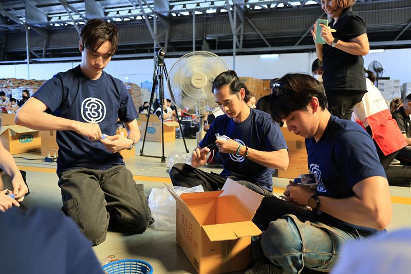 โดย คุณปริศนา กล่ำพินิจ AVP กิจการองค์กร ตัวแทนผู้บริหารสถานีโทรทัศน์ไทยทีวีสีช่อง 3 พาทีมนักแสดง สมิธ ภาสวิชญ์ บูรณนัติ – ยิหวา ปรียากานต์ ใจกันทะ – ตี๋ ธนพล จารุจิตรานนท์ – ปอม ภาสกร เครือโสภณ – เบสท์ ชนิดาภา พงศ์ศิลป์พิพัฒน์ และ นีญ่า มากีลา ร่วมกับนักแสดงจิตอาสา มูลนิธิสวัสดิการนักแสดง จับมือองค์กรพันธมิตร จิตอาสาภาคประชาชน และกำลังพลจากกองทัพ พร้อมด้วยเจ้าหน้าที่มูลนิธิฯ ร่วมกันจัดเตรียมเครื่องอุปโภคบริโภคที่จำเป็นต่อการดำรงชีพ และบรรจุลงถุงยังชีพสีม่วง – สีส้ม แยกตามฐานต่างๆ จำนวน 12,600 ชุด พร้อมลำเลียงขึ้นรถบรรทุก เพื่อส่งไปช่วยเหลือบรรเทาทุกข์ให้กับผู้ประสบภัยต่อไป