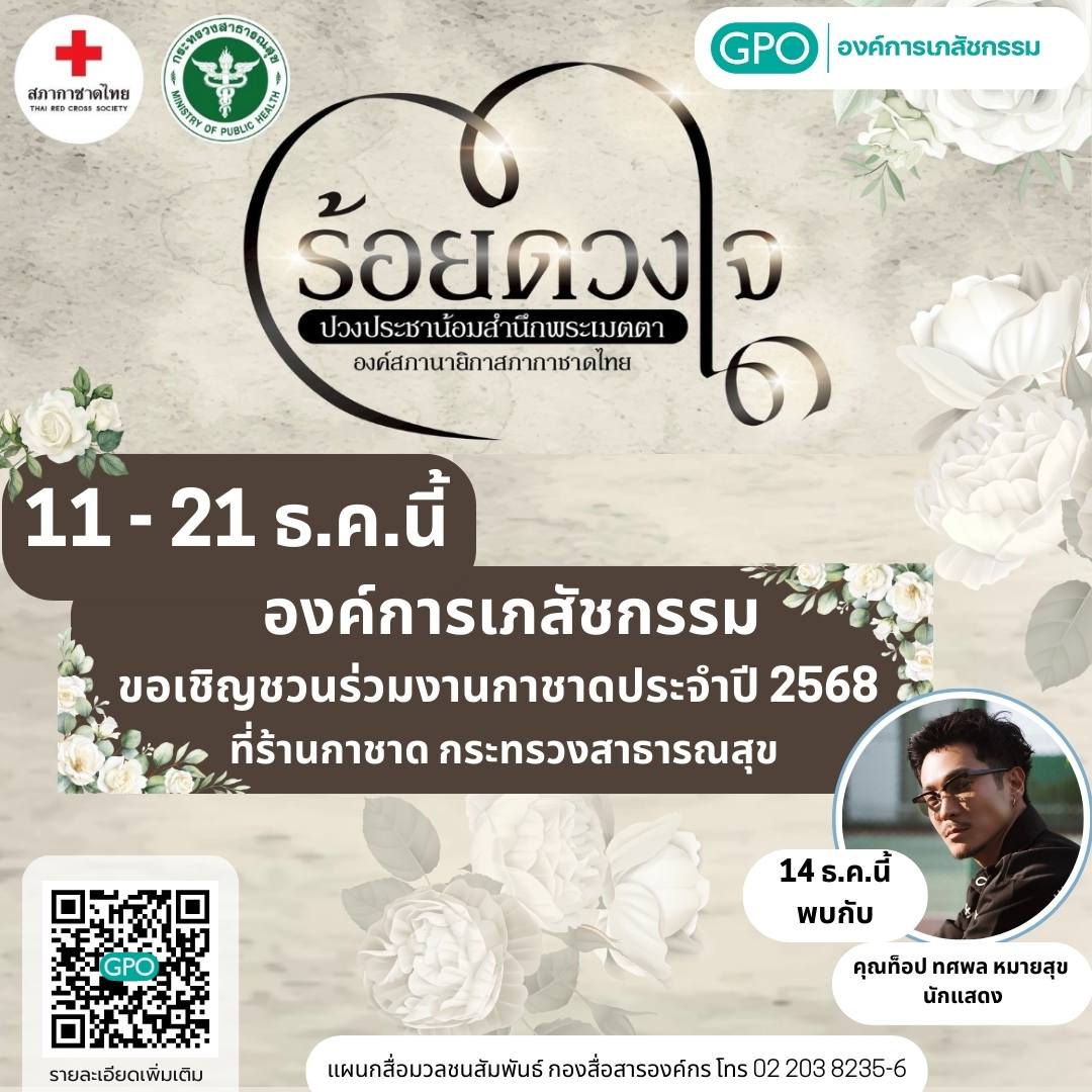 องค์การเภสัชกรรม ร่วมออกร้านกาชาด ในงานกาชาด ประจำปี 2568 โดยในปีนี้จัดขึ้นระหว่าง วันที่ 11 - 21 ธันวาคม 2568 รวม 11 วัน 11 คืน ตั้งแต่เวลา 11.00 – 22.00 น. โดยการจัดงานในครั้งนี้จัดขึ้นภายใต้แนวคิด “ร้อยดวงใจปวงประชา น้อมสำนึกพระเมตตา องค์สภานายิกาสภากาชาดไทย” เพื่อถวายความอาลัยและน้อมสำนึกในพระมหากรุณาธิคุณ สมเด็จพระนางเจ้าสิริกิติ์ พระบรมราชินีนาถ พระบรมราชชนนีพันปีหลวง สภานายิกาสภากาชาดไทย