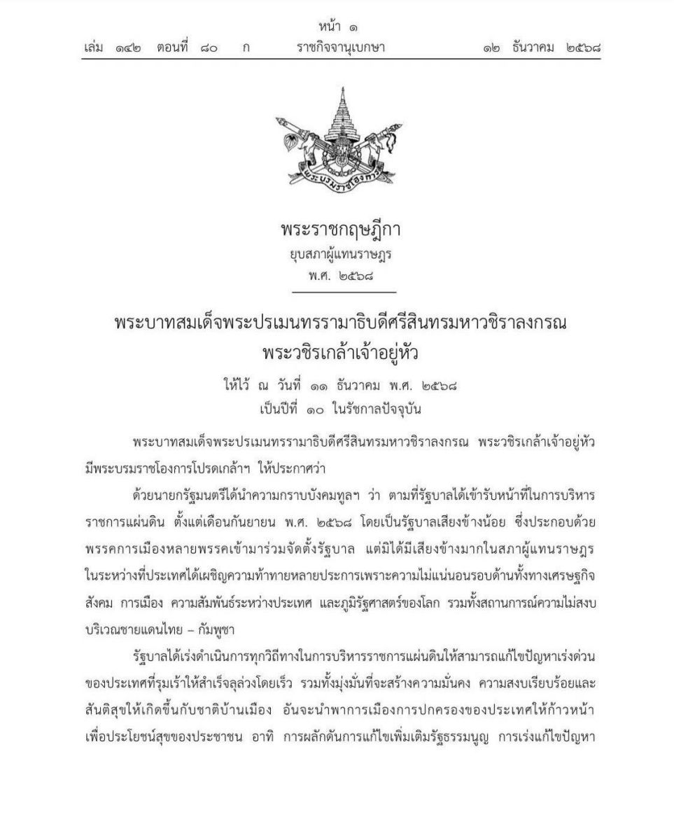 ด้วยนายกรัฐมนตรีได้นำความกราบบังคมทูลฯ ว่า ตามที่รัฐบาลได้เข้ารับหน้าที่ในการบริหารราชการแผ่นดิน ตั้งแต่เดือนกันยายน พ.ศ. ๒๕๖๘ โดยเป็นรัฐบาลเสียงข้างน้อย ซึ่งประกอบด้วยพรรคการเมืองหลายพรรคเข้ามาร่วมจัดตั้งรัฐบาล แต่มิได้มีเสียงข้างมากในสภาผู้แทนราษฎรในระหว่างที่ประเทศได้เผชิญความท้าทายหลายประการเพราะความไม่แน่นอนรอบด้าน ทั้งทางเศรษฐกิจ สังคม การเมือง ความสัมพันธ์ระหว่างประเทศ และภูมิรัฐศาสตร์ของโลก รวมทั้งสถานการณ์ความไม่สงบบริเวณชายแดนไทย – กัมพูชา
