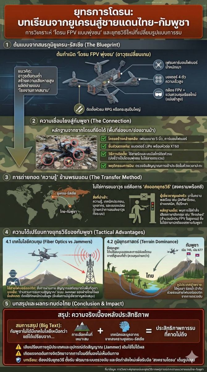 สำหรับการวิเคราะห์รูปแบบโครงสร้าง อุปกรณ์ และภูมิยุทธศาสตร์จากซากโดรนที่ยึดได้ในพื้นที่ไทย ทำให้เห็นความเชื่อมโยงของแนวคิดทางยุทธวิธี และสาเหตุที่กัมพูชาสามารถใช้โดรนได้ แม้ไม่มีประวัติการฝึกมาก่อนอย่างชัดเจน