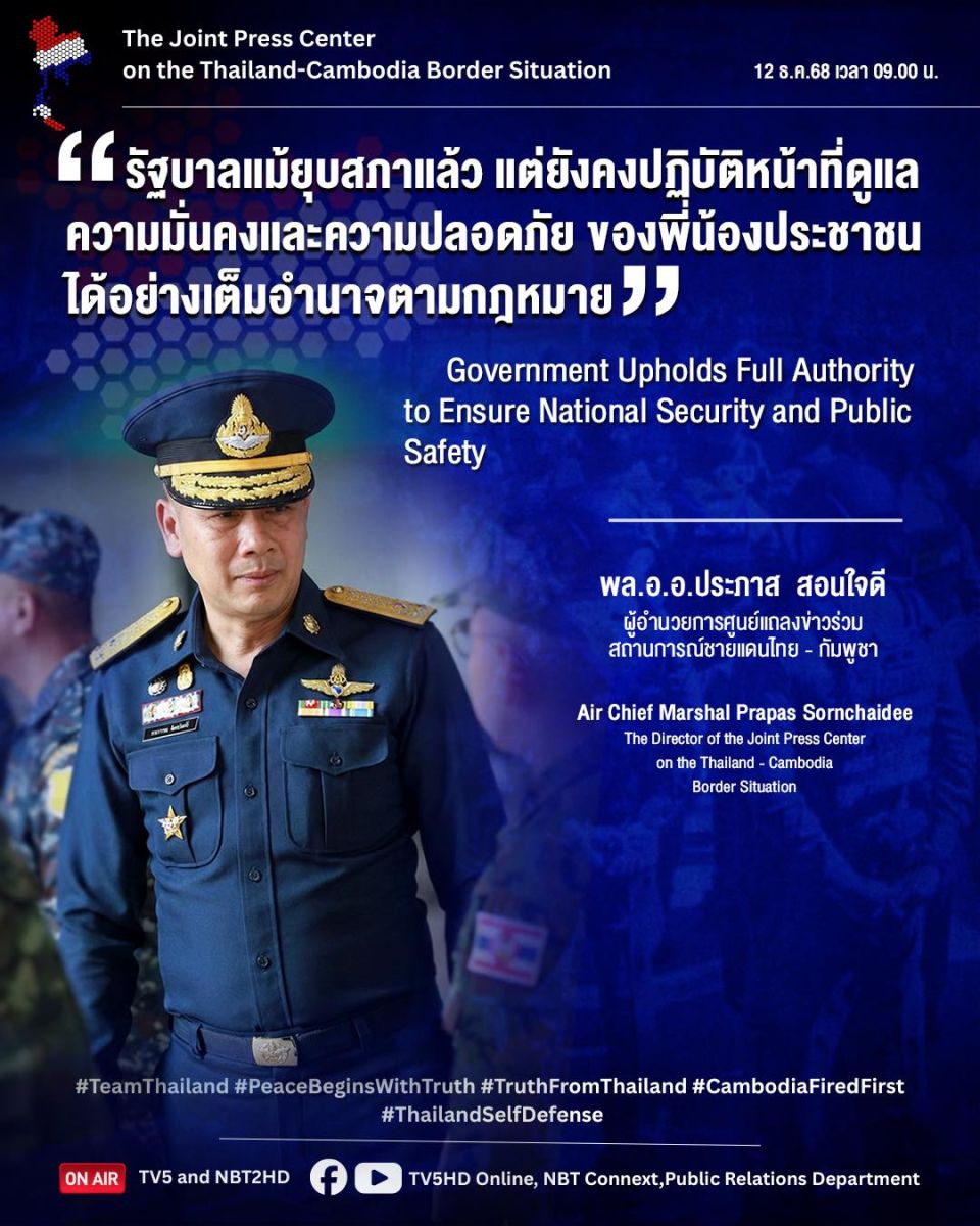 วันที่ 12 ธันวาคม 2568 เพจกองบัญชาการกองทัพไทย Royal Thai Armed Forces Headquarters โพสต์ข้อความระบุ พลอากาศเอก ประภาส สอนใจดี ผู้อํานวยการศูนย์แถลงข่าวร่วมสถานการณ์ไทย – กัมพูชา เปิดเผยว่า แม้มีการยุบสภาเมื่อวันที่ 11 ธันวาคมที่ผ่านมา แต่รัฐบาลยังคงปฏิบัติหน้าที่ และมีอํานาจ ดูแลความมั่นคงของประเทศอย่างครบถ้วนตามกฎหมาย เพื่อให้การปกป้องประชาชนไทยเป็นไปอย่างต่อเนื่อง