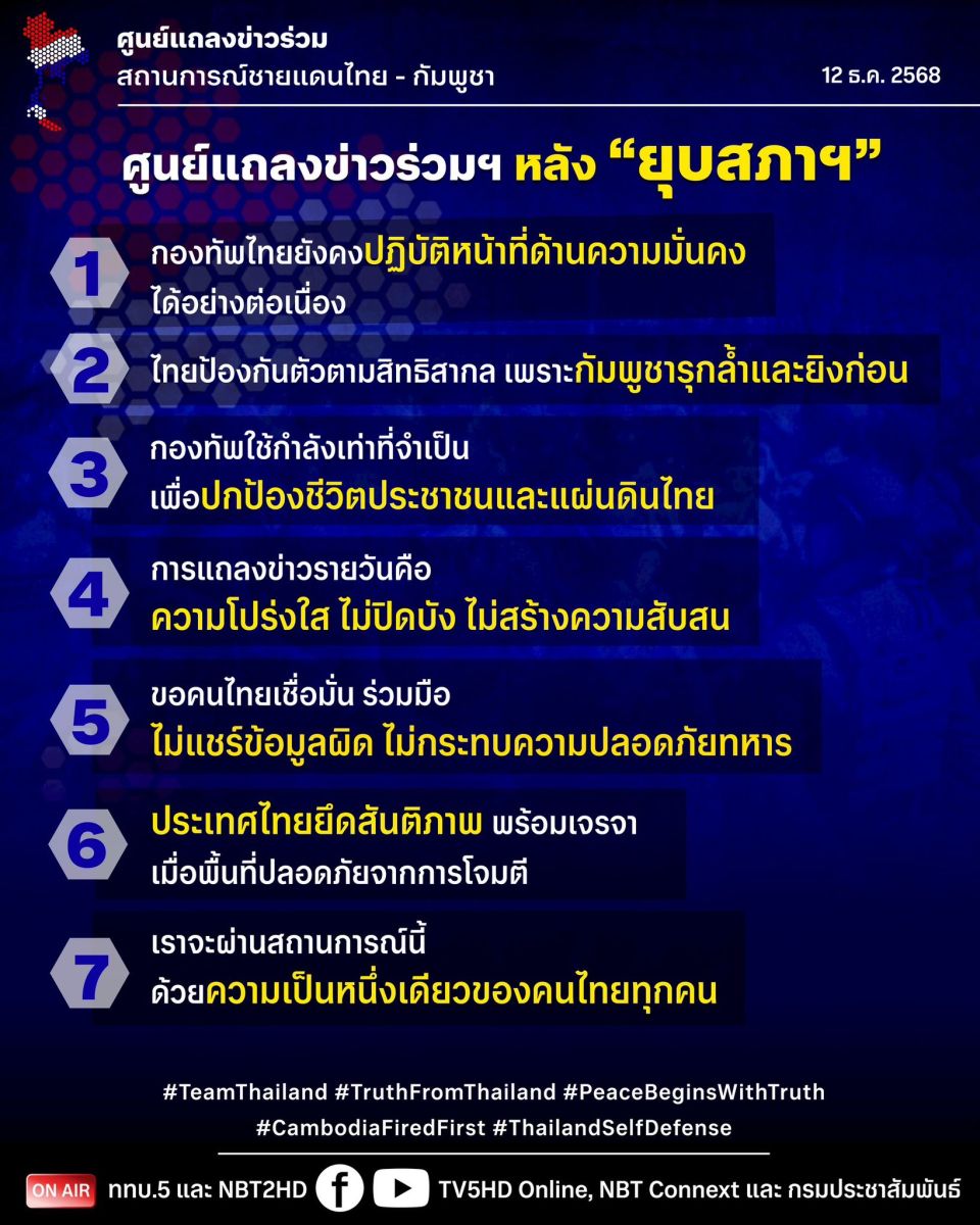 กฎอัยการศึกในพื้นที่ชายแดนมีผลบังคับใช้ตามกฎหมายความมั่นคงของไทย และศูนย์แถลงข่าวร่วมฯ จะรายงานสถานการณ์อย่างโปร่งใส เพื่อให้ประชาชนได้รับข้อมูลที่ถูกต้อง ประเทศไทยยังคงยึดมั่นในหลักสันติวิธี และปรารถนาสันติภาพกับกัมพูชา แต่ในขณะเดียวกันจะปกป้องแผ่นดินไทยอย่างเด็ดขาด และชอบธรรม เพื่อความสงบสุขของประชาชนไทยเป็นสําคัญ