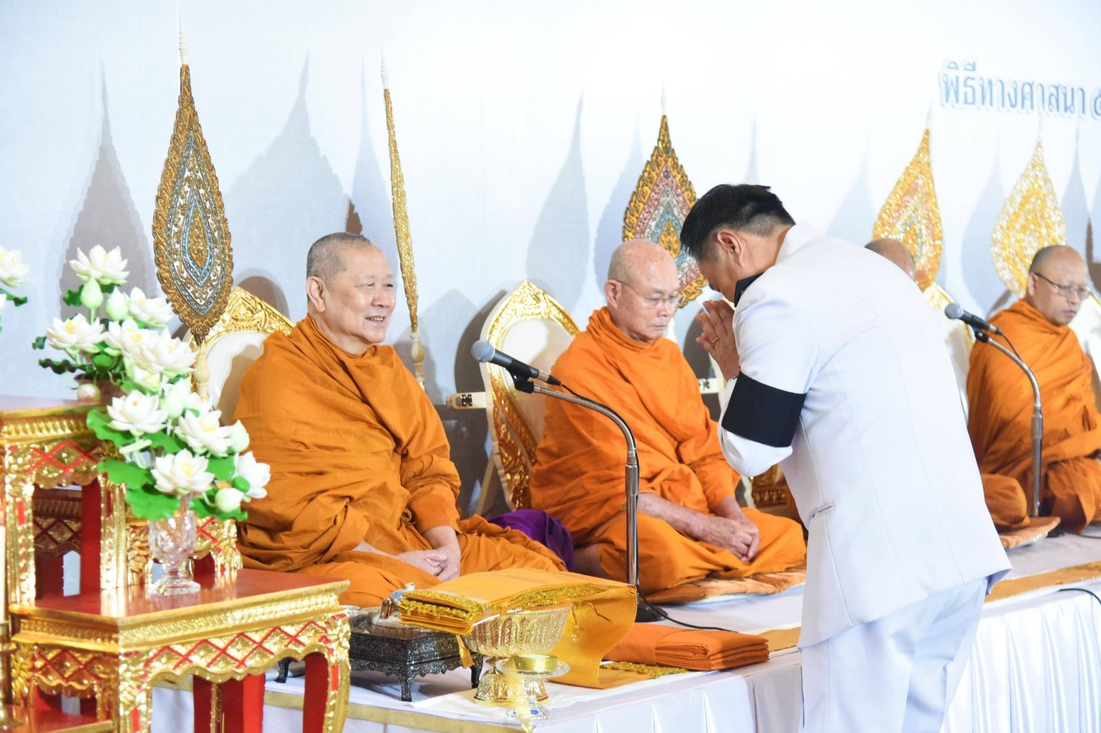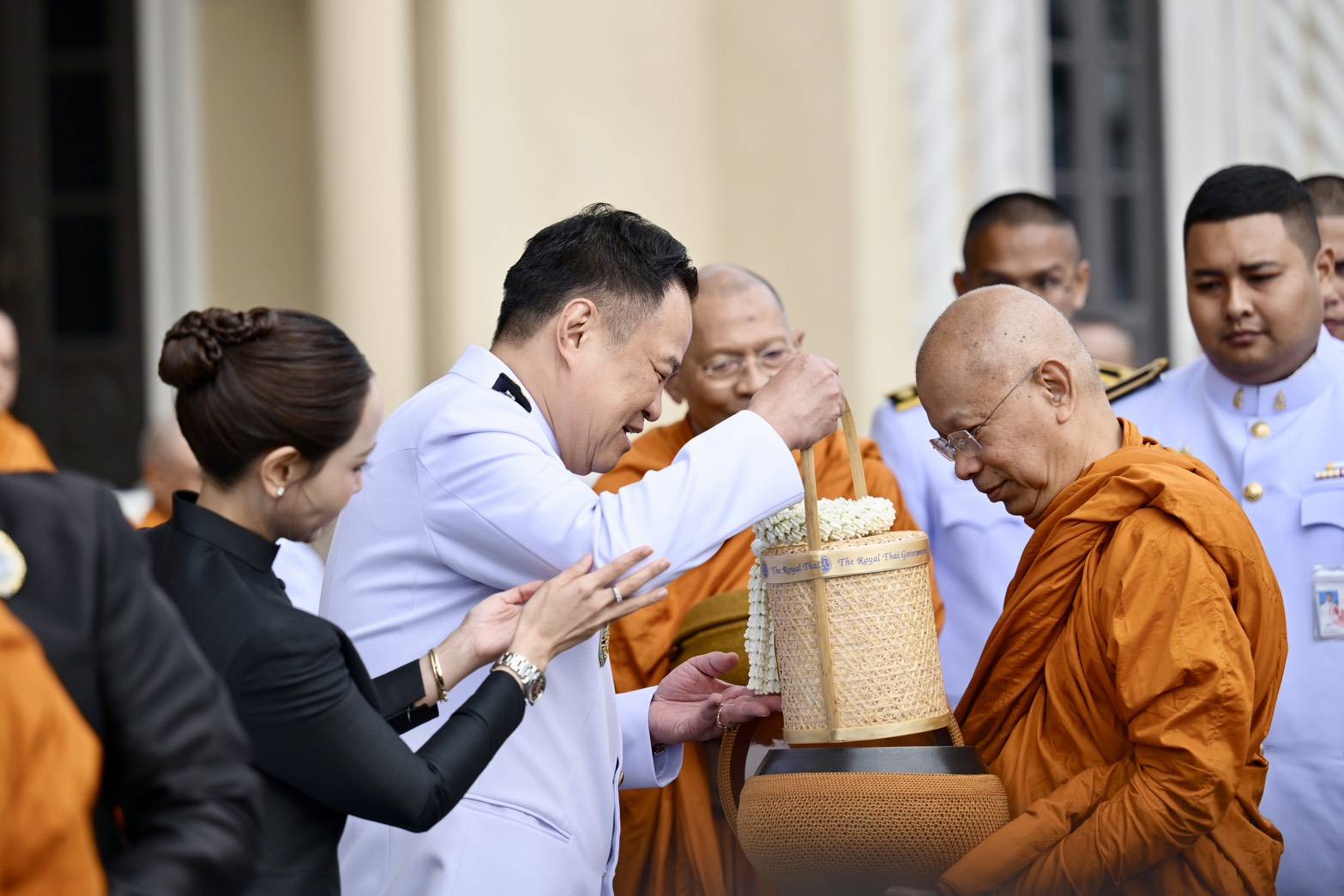 นายกรัฐมนตรี จุดเทียนบูชาพระรัตนตรัย และจุดธูปเทียนเครื่องทองน้อยเบื้องหน้าพระบรมฉายาลักษณ์สมเด็จพระนางเจ้าสิริกิติ์ พระบรมราชินีนาถ พระบรมราชชนนีพันปีหลวง ถวายเครื่องไทยธรรมและผ้าไตรแด่พระสงฆ์ รวมจำนวน 10 รูป จากนั้นเวลา 08.00 น. นายกรัฐมนตรี พร้อมคณะร่วมใส่บาตรพระสงฆ์ ณ บริเวณด้านหน้าตึกสันติไมตรี