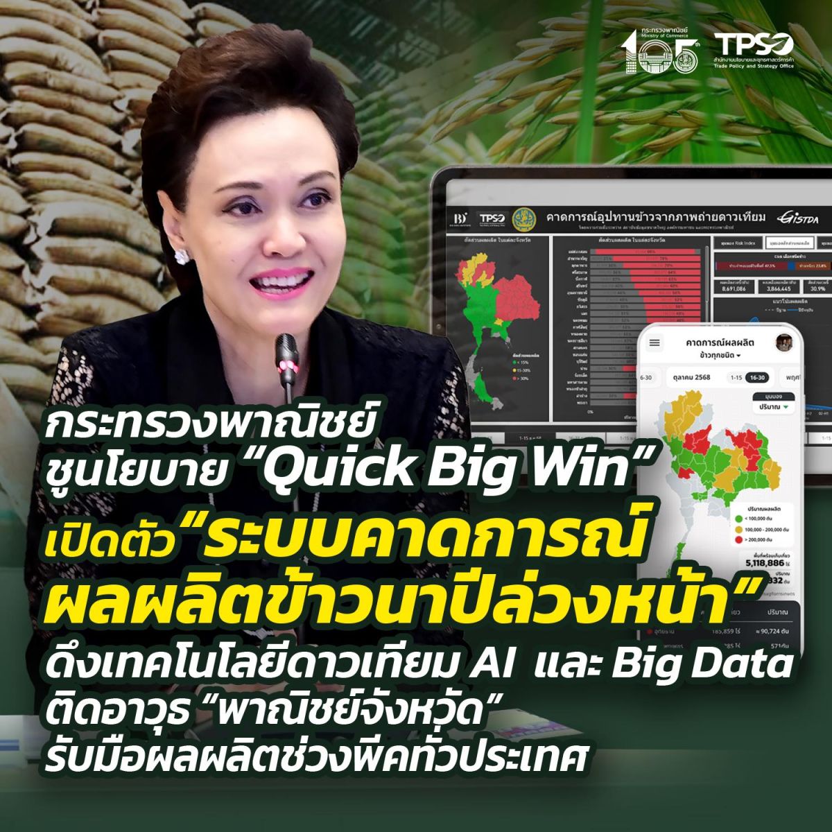 กระทรวงพาณิชย์ ชูนโยบาย “Quick Big Win” ยกระดับการค้าด้วยข้อมูลเปิดตัว “ระบบคาดการณ์ผลผลิตข้าวนาปีล่วงหน้า” ดึงเทคโนโลยีดาวเทียม AI และ Big Data ติดอาวุธ “พาณิชย์จังหวัด” รับมือผลผลิตช่วงพีคทั่วประเทศ