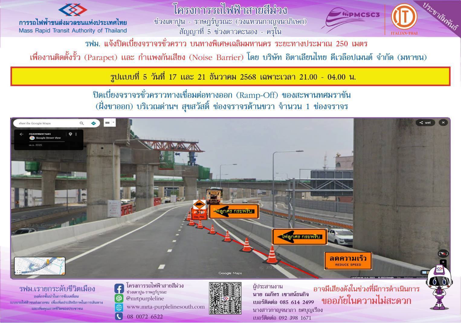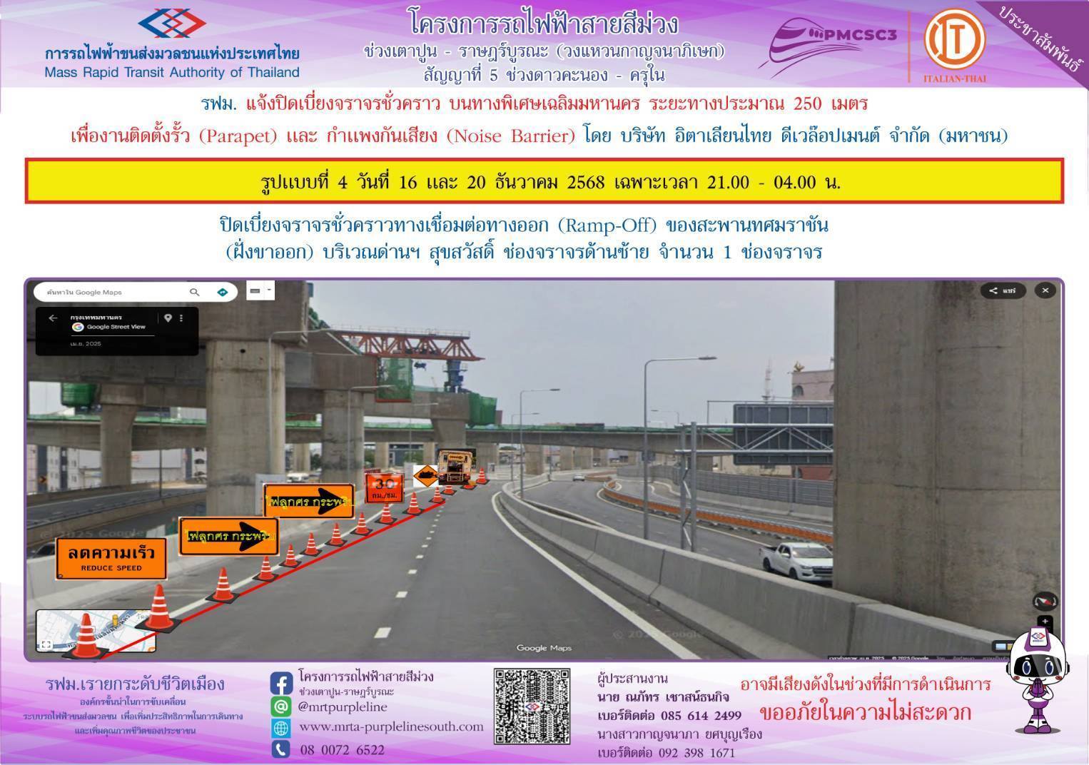 การทางพิเศษแห่งประเทศไทย (กทพ.) กระทรวงคมนาคม ได้รับการประสานงานจาก การรถไฟฟ้า ขนส่งมวลชนแห่งประเทศไทย (รฟม.) แจ้งว่า บริษัท อิตาเลียนไทย ดีเวล๊อปเมนต์ จำกัด (มหาชน) ผู้รับจ้างงานก่อสร้างทางวิ่งและสถานียกระดับ อาคารจอดรถไฟฟ้าและอาคารจอดแล้วจร โครงการรถไฟฟ้าสายสีม่วง ช่วงเตาปูน - ราษฎร์บูรณะ (วงแหวนกาญจนาภิเษก) สัญญาที่ 5 ช่วงดาวคะนอง – ครุใน จึงมีความจำเป็นต้องปิดเบี่ยงจราจรชั่วคราว บนทางพิเศษเฉลิมมหานคร ระยะทางประมาณ 250 เมตร เพื่องานติดตั้งรั้ว (Parapet) และกำแพงกันเสียง (Noise Barrier) ในวันที่ 13 - 21 ธันวาคม 2568 เฉพาะเวลา 21.00 - 04.00 น. โดยมีการจัดการจราจร 5 รูปแบบ ดังนี้