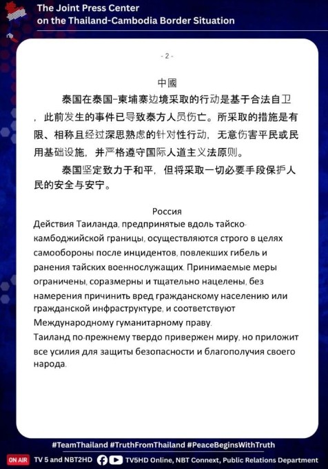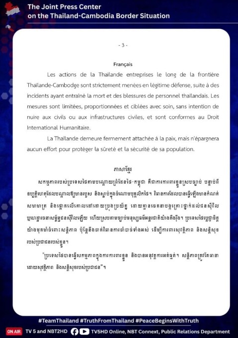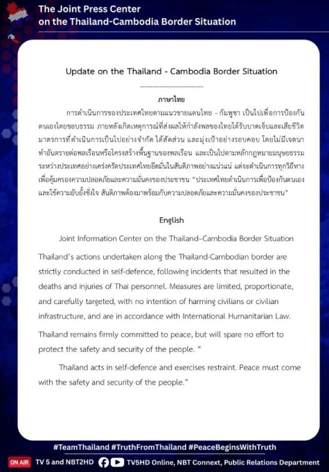 ศูนย์แถลงข่าวร่วม สถานการณ์ชายแดนไทย - กัมพูชา ประเทศไทยยืนยันการปฏิบัติภายใต้กฎหมายระหว่างประเทศ มุ่งปกป้องประชาชน ควบคุมสถานการณ์ และรักษาสันติภาพ ย้ำ เพื่อคุ้มครองชีวิตประชาชนและความมั่นคงของประเทศ