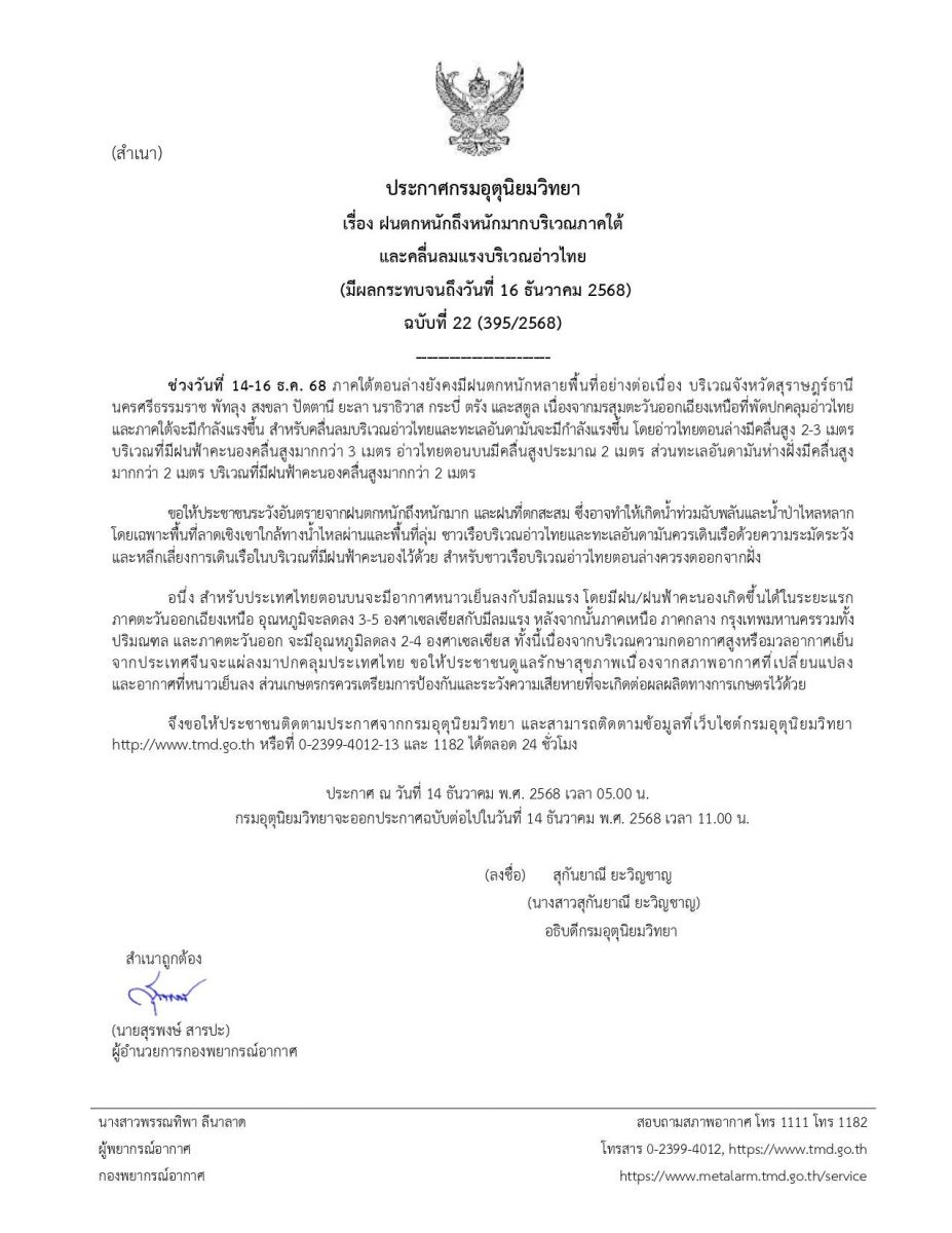 วันที่ 14 ธ.ค.2568 กรมอุตุนิยมวิทยา ประกาศ เรื่อง ฝนตกหนักถึงหนักมากบริเวณภาคใต้ และคลื่นลมแรงบริเวณอ่าวไทย (มีผลกระทบจนถึงวันที่ 16 ธันวาคม 2568) ฉบับที่ 22 (395/2568) ระบุว่า ช่วงวันที่ 14-16 ธ.ค. 68 ภาคใต้ตอนล่างยังคงมีฝนตกหนักหลายพื้นที่อย่างต่อเนื่อง บริเวณจังหวัดชุมพร สุราษฎร์ธานี นครศรีธรรมราช พัทลุง สงขลา ปัตตานี ยะลา นราธิวาส กระบี่ ตรัง และสตูล เนื่องจากมรสุมตะวันออกเฉียงเหนือที่พัดปกคลุมอ่าวไทยและภาคใต้จะมีกำลังแรงขึ้น