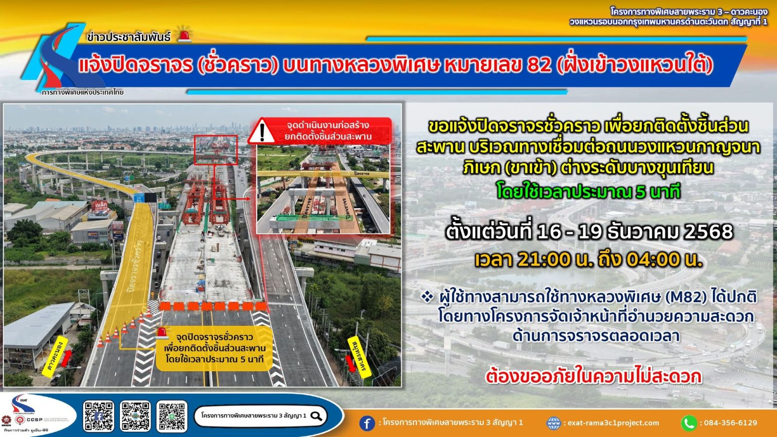 โดยจะปิดจราจร (ชั่วคราว) บนทางหลวงพิเศษ หมายเลข 82 เพื่อยกติดตั้งชิ้นส่วนสะพาน บริเวณทางเชื่อมต่อถนนวงแหวนกาญจนาภิเษก (ขาเข้า) ต่างระดับบางขุนเทียน ตั้งแต่วันที่ 16-19 ธันวาคม 2568 เวลา 21:00 น. ถึง 04:00 น. โดยใช้เวลาครั้งละประมาณ 5 นาที