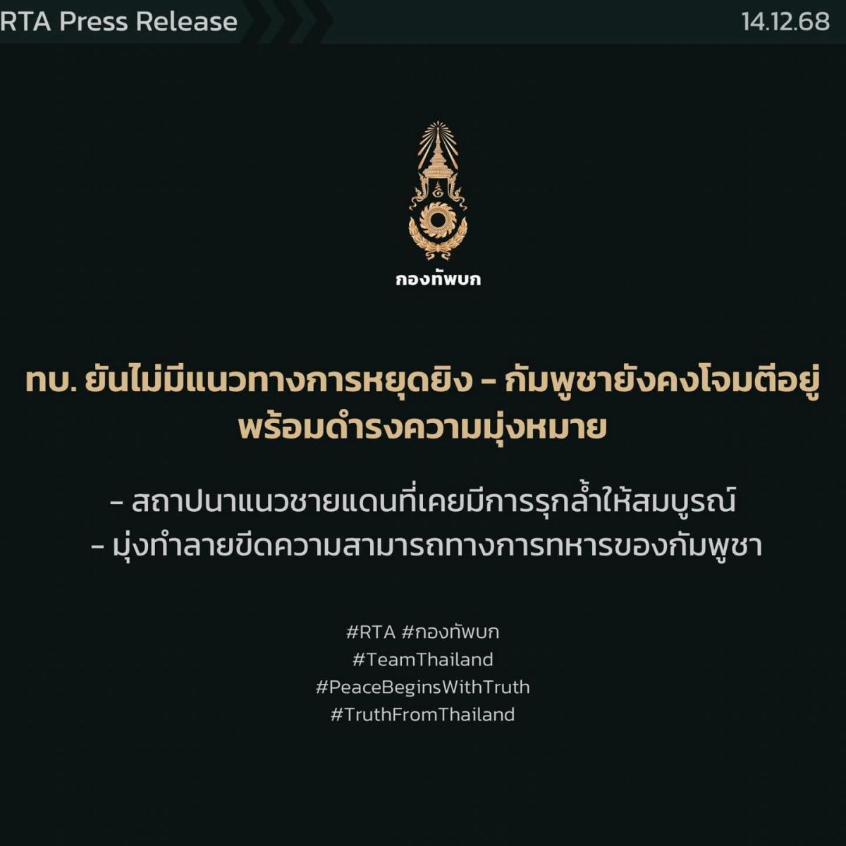 ทบ. เผยไม่มีแนวทางการหยุดยิง โดยยังพบกัมพูชาโจมตีต่อกำลังทหารและพื้นที่พลเรือนไทยอย่างต่อเนื่อง ยืนยันการปฏิบัติการทางทหารที่มีเป้าหมายหลักเพื่อขจัดภัยคุกคามและควบคุมพื้นที่ด้านความมั่นคง