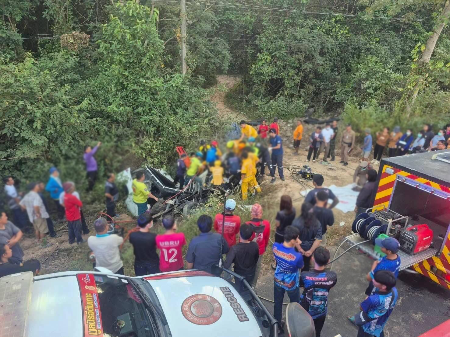 รถกระบะเสียหลักพลิกคว่ำลงข้างทาง ริมถนนแจ้งสนิท อาสากู้ภัยใช้เครื่องมืองัดรถนำร่างผู้เสียชีวิต 2 รายออกจากยานพาหนะ จ.อุบลราชธานี