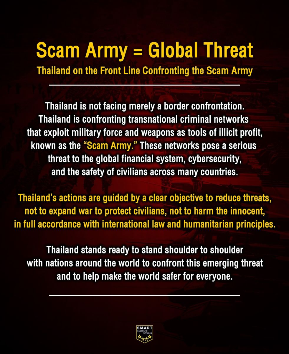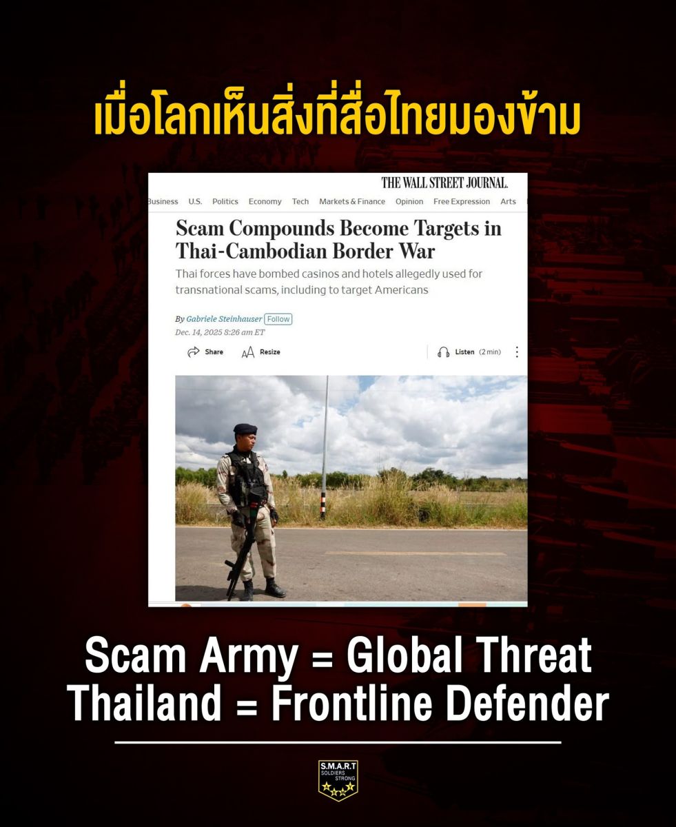18 ธันวาคม 2568 เพจ กองทัพภาคที่ 2 โพสต์ข้อความระบุ "SMART Soldiers | เมื่อโลกเห็นสิ่งที่สื่อไทยมองข้าม Scam Army = Global ThreatThailand = Frontline Defender มีข่าวหนึ่งที่สื่อไทยแทบไม่ให้ความสนใจ แต่กลับเป็นประเด็นใหญ่ในสายตาสื่อต่างชาติ รวมถึง The Wall Street Journal ขณะที่หลายสำนักในไทยเลือกโฟกัสเพียงถ้อยคำของประธานาธิบดีทรัมป์