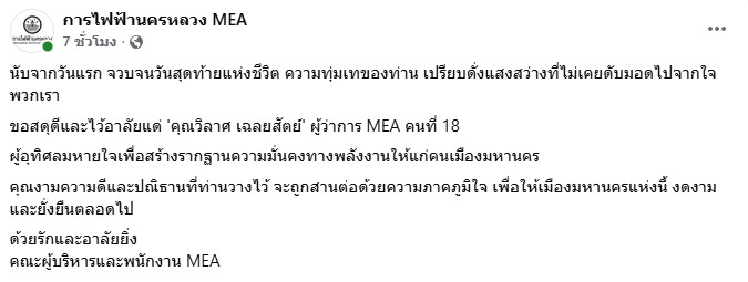 MEA ขอยืนหยัดสานต่อปณิธานและความตั้งใจของผู้ว่าการวิลาศ เฉลยสัตย์ ในการขับเคลื่อนองค์กรด้วยหัวใจ เพื่อให้พลังงานไฟฟ้าเป็นกลไกสำคัญในการสร้างความสุขและขับเคลื่อนเศรษฐกิจของเมืองมหานครสืบไป