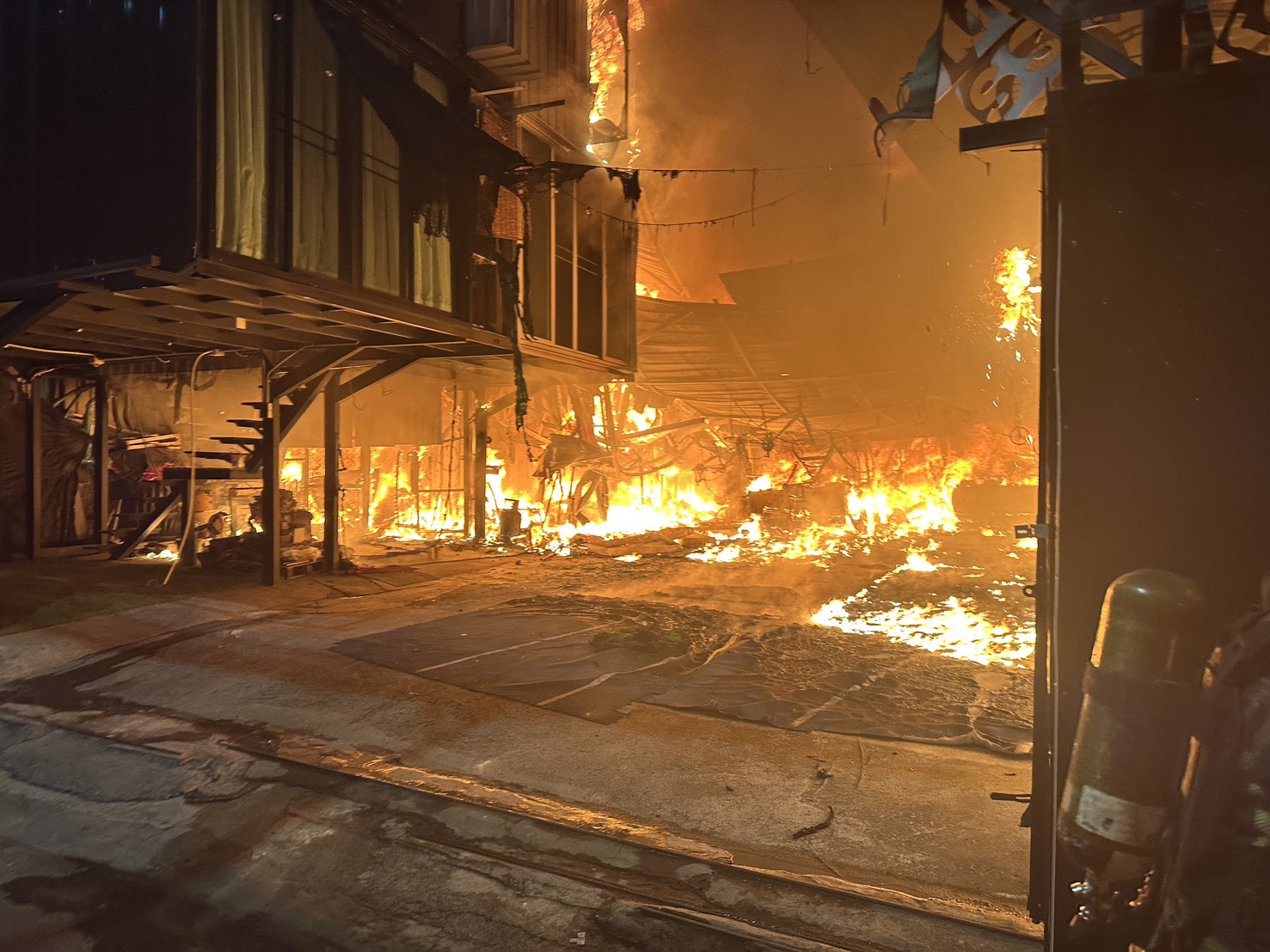 ลักษณะที่เกิดเหตุเป็นบ้านเดี่ยว 2 ชั้น โครงสร้างเหล็กมุงเมทัลชีท ใช้เป็นที่พักอาศัย ต้นเพลิงเกิดขึ้นที่ชั้นล่าง ภายในห้องนั่งเล่น เพลิงลุกไหม้บ้านต้นเพลิงเสียหายหมดทั้งหลัง ลุกลามรถยนต์จำนวน 3 คัน
