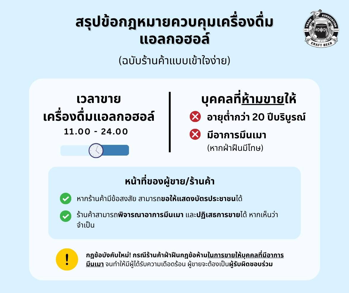 ล่าสุด เพจ สมาคมคราฟท์เบียร์ ได้อธิบายข้อกฎหมายและแนวทางในส่วนของร้านค้า เพื่อดำเนินการตามกฎหมาย พร้อมทั้งกับรรณงค์ให้ ร้านค้าผู้ประกอบการ ตระหนักถึงการดื่มที่มีคุณภาพ เพื่อรับผิดชอบต่อสังคม โดยระบุข้อความว่า สรุปข้อกฎหมายควบคุมเครื่องดื่มแอลกอฮอล์ (ฉบับร้านค้าแบบเข้าใจง่าย) ที่มีผลบังคับใช้แล้ว