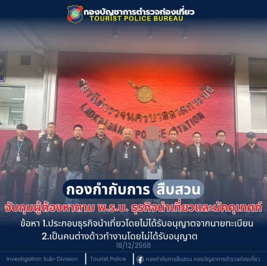เมื่อวันที่ 18 ธันวาคม 2568 เจ้าหน้าที่ตำรวจ(กก.สืบสวน บช.ทท.) ระดมกวาดล้างอาชกรรม พร้อมด้วย งานสืบสวน กก.3 บก.ทท.1 จับกุมชายชาวต่างชาติ (สัญชาติอังกฤษ) ลักลอบทำงานเป็นมัคคุเทศก์ สร้างความเสียหายให้แก่อุตสาหกรรมการท่องเที่ยวของประเทศไทย จำนวน 1 ราย พบการกระทำความผิด 2 ข้อหา ดังนี้