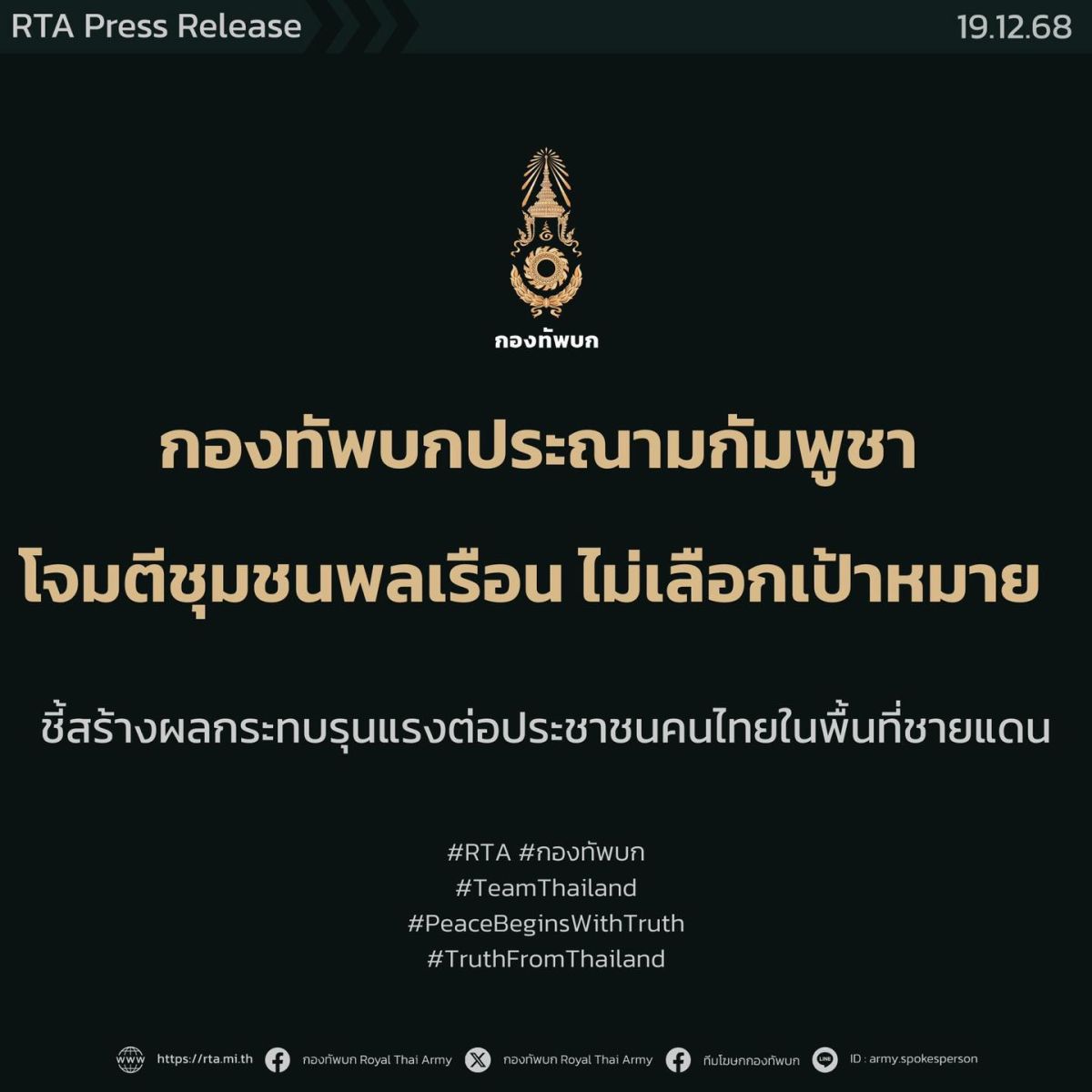 โฆษกกองทัพบกระบุว่าการมุ่งเป้าโจมตีของฝ่ายกัมพูชาเป็นการใช้กำลังในลักษณะไม่เลือกเป้าหมายซึ่งก่อให้เกิดความเสียหายและผลกระทบต่อชีวิตประชาชนเพิ่มมากขึ้นอย่างหลีกเลี่ยงไม่ได้ประชาชนคนไทยไม่ควรต้องตกเป็นเป้าหมายหรือได้รับผลกระทบจากการกระทำทางทหารในลักษณะดังกล่าวกองทัพบกขอเรียกร้องให้ฝ่ายกัมพูชายุติการกระทำที่ก่อให้เกิดความรุนแรงต่อประชาชนผู้บริสุทธิ์ในทันทีพร้อมทั้งปฏิบัติตามหลักกฎหมายระหว่างประเทศและกฎหมายมนุษยธรรมอย่างเคร่งครัด