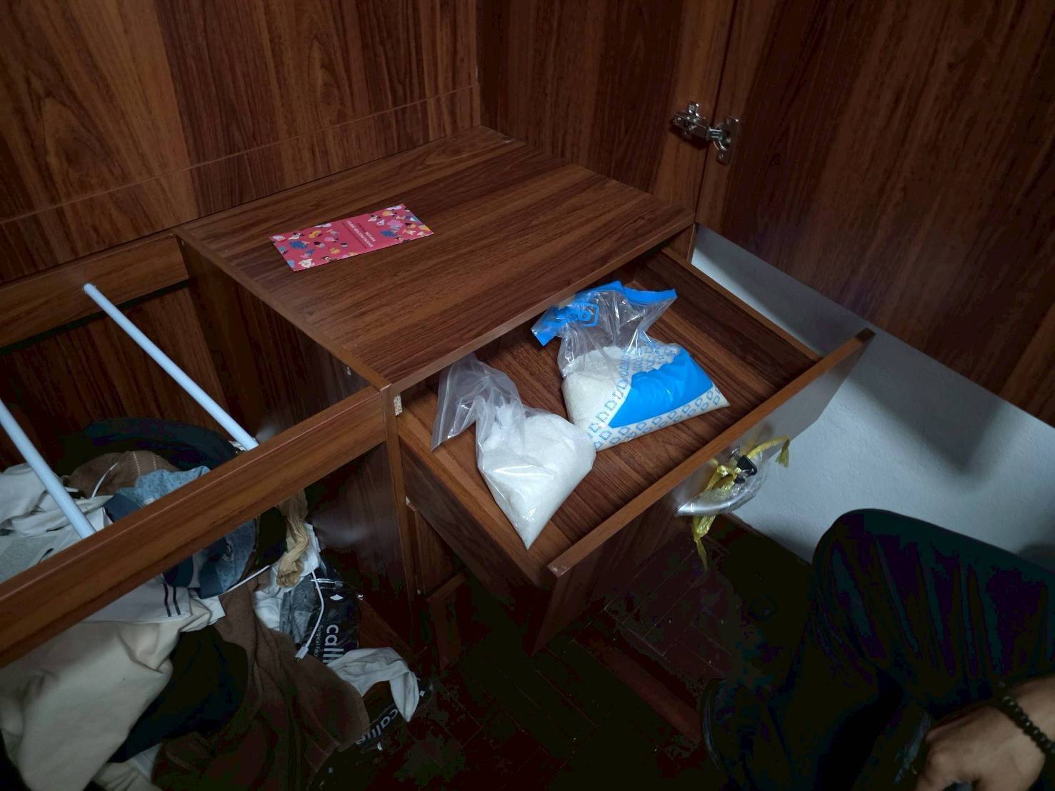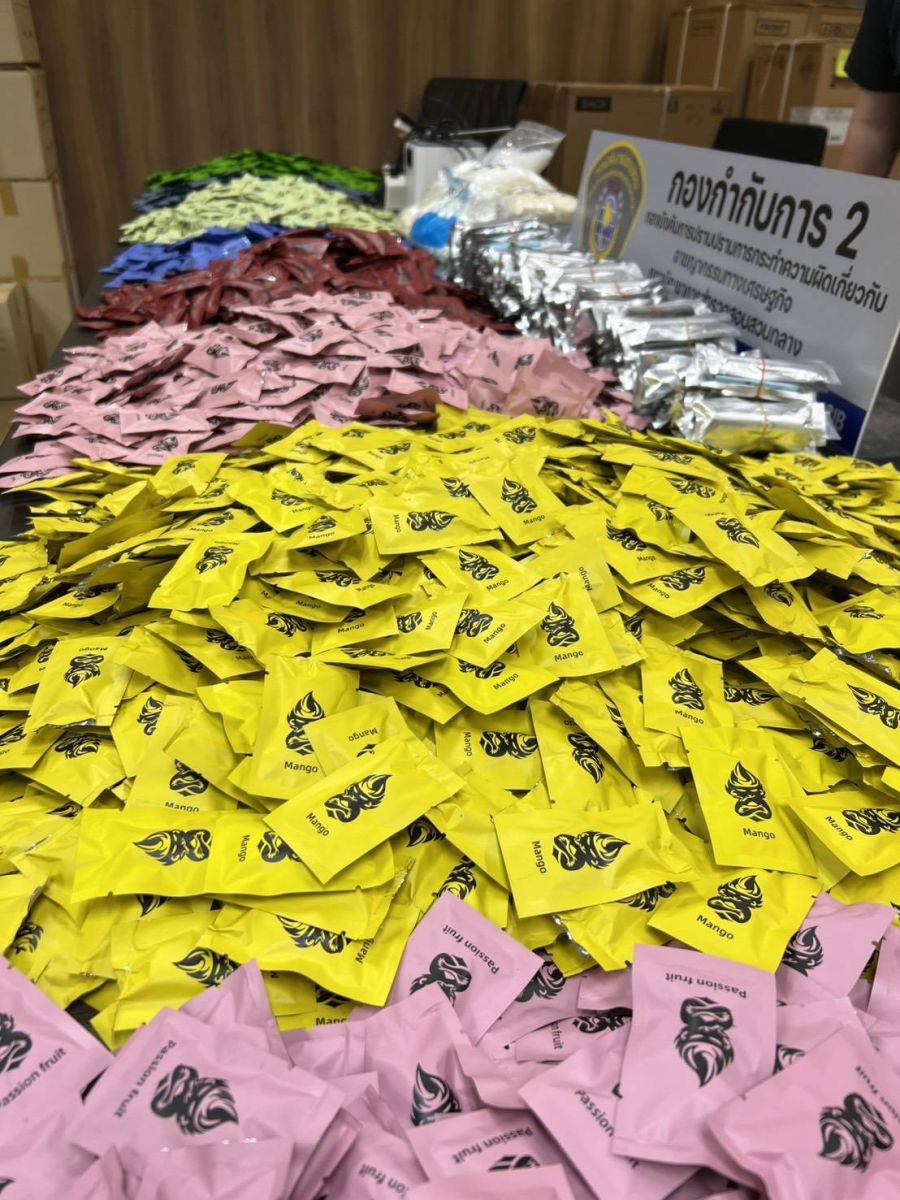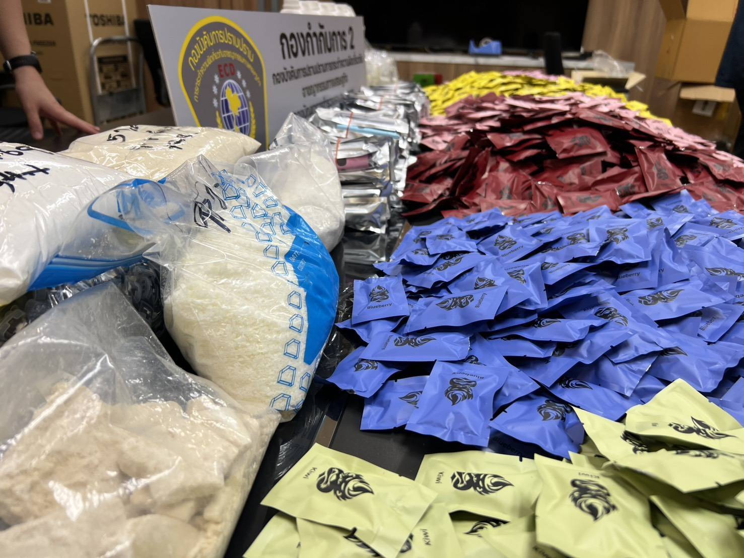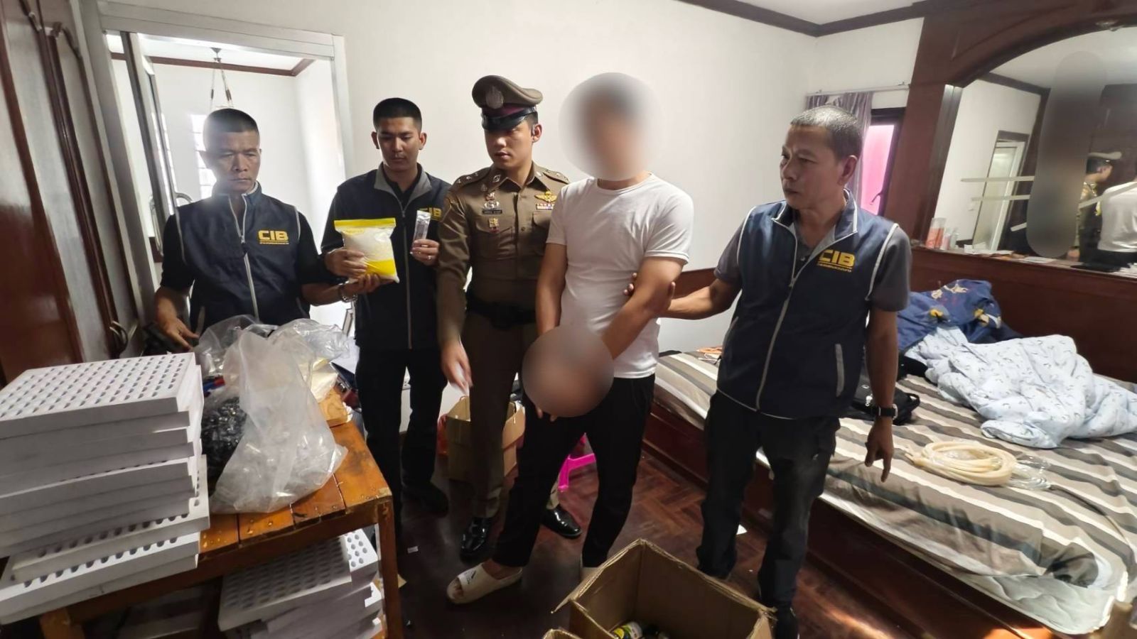 วันที่ 20 ธ.ค. 68 พล.ต.ต.ทัศน์ภูมิ จารุปรัชญ์ ผบก.ปอศ. พร้อมเจ้าหน้าที่ กก.2 บก.ปอศ. นำกำลังจับกุม นายจาง อายุ 36 ปี สัญชาติจีน พร้อมของกลาง หัวบุหรี่ไฟฟ้าพร้อมใช้บรรจุถุง (พอตเค) จำนวน 4,945 ซอง หัวบุหรี่ไฟฟ้าเปล่า 15,000 หัว , คอยส์หัวบุหรี่ไฟฟ้า 18,000 ชิ้น , ตัวเครื่องบุหรี่ไฟฟ้า 300 ชิ้น , น้ำยาบุหรี่ไฟฟ้า 85 แกลลอน, จุกปิดหัวบุหรี่ไฟฟ้า 50,000 ชิ้น , ซองบรรจุภัณฑ์ 8 ลัง , เครื่องซีลสุญญากาศ 4 เครื่อง,เครื่องทำความร้อน 5 เครื่อง , ตาชั่ง 5 เครื่อง , บีกเกอร์/สายยาง/ตัวทำละลาย , ผงสีขาวขุ่น และ ใส (อยู่ระหว่างส่งตรวจพิสูจน์สารเอโทมิเดต-เป็นวัตถุออกฤทธิ์ต่อจิตประสาทประเภท 2 ที่ใช้ในการผลิตหัวพอตเค) จำนวน 11 ถุง น้ำหนักรวมกว่า 3,800 กรัม รวมมูลค่าของกลางกว่า 10 ล้านบาท ได้ที่บ้านหลังหนึ่ง ภายในซอย 15 หมู่ที่ 10 ต.หนองปรือ อ.บางละมุง จ.ชลบุรี
