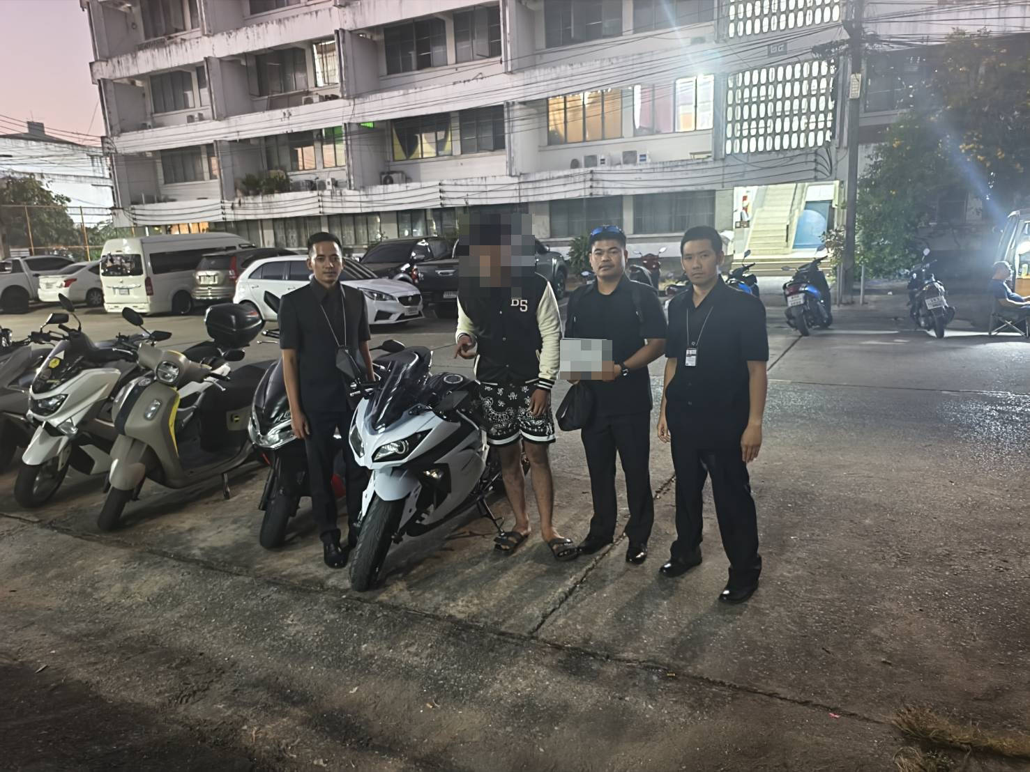 จากการสอบถาม นายใหญ่ (นามสมมุติ) ยอมรับว่าตามเวลาเกิดเหตุได้นั่งรถยนต์มากับเพื่อนรุ่นพี่ จากนั้นมาลงที่หน้าคอนโด จากนั้นได้เดินเข้าไปบริเวณลานจอดรถ จัดรยานยนต์ แล้วเสียบกุญแจเปิดสตาร์ท รถจักรยานยนต์ ยี่ห้อ Kawasaki รุ่น Ninja 300 สีขาว ของผู้เสียหายออกมา แล้วขับไปจอดที่หน้าแฟลต 31 เขตดอนเมือง จากนั้นได้ถอดแผ่นป้ายทะเบียนออกไว้ที่หน้าห้องพักของตน เจ้าหน้าที่จึงได้นำตัวนายใหญ่ (นามสมมุติ) ไปตรวจยึดแผ่นป้ายทะเบียนรถผู้เสียหาย ก่อนนำตัวสอบสวนต่อที่ สน.หัวหมาก