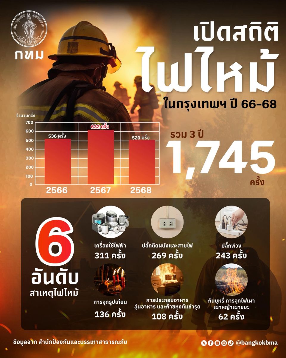 เพลิงไหม้ 3 ปีล่าสุด: พบสาเหตุอันดับหนึ่งมาจากหมวดอุปกรณ์และเครื่องใช้ไฟฟ้ารวมกัน 823 ครั้ง จากทั้งหมด 1,745 ครั้ง ที่เป็นสถิติข้อสันนิษฐานสาเหตุเพลิงไหม้ในกรุงเทพมหานคร โดยสำนักป้องกันและบรรเทาสาธารณภัย 3 ปีล่าสุด (2566–2568)