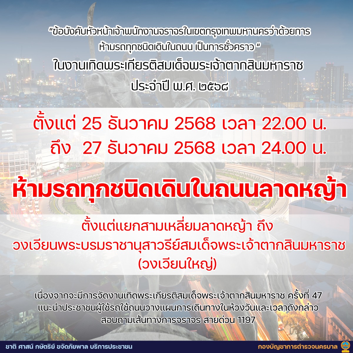 “ข้อบังคับหัวหน้าเจ้าพนักงานจราจรในเขตกรุงเทพมหานคร ว่าด้วยการห้ามรถทุกชนิดเดินในถนน เป็นการชั่วคราว ในงานเทิดพระเกียรติสมเด็จพระเจ้าตากสินมหาราช ประจำปี พ.ศ. ๒๕๖๘”
