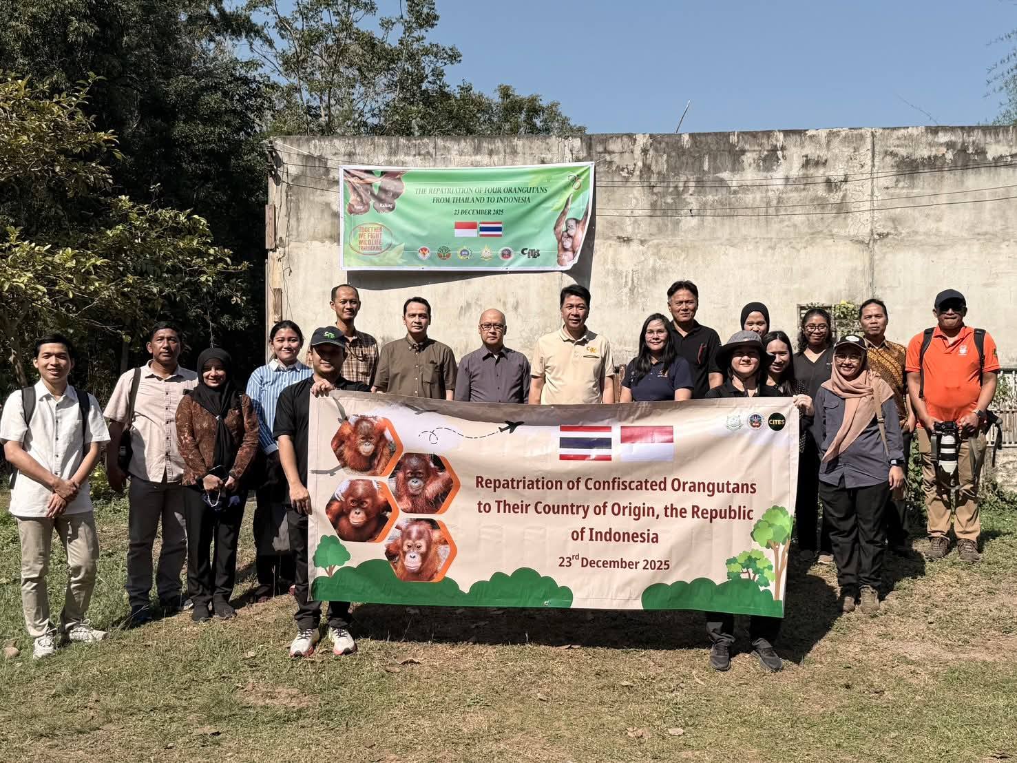 22 ธันวาคม 2568 เพจ กรมอุทยานแห่งชาติ สัตว์ป่า และพันธุ์พืช รายงาน กรมอุทยานฯ ร่วมกับสถานเอกอัครราชทูตอินโดนีเซีย ตรวจสุขภาพและเตรียมความพร้อมขั้นสุดท้าย ก่อนส่งอุรังอุตัง 4 ตัว กลับบ้านเกิดที่อินโดนีเซีย ภายใต้ความร่วมมือระหว่างประเทศตามอนุสัญญาไซเตส