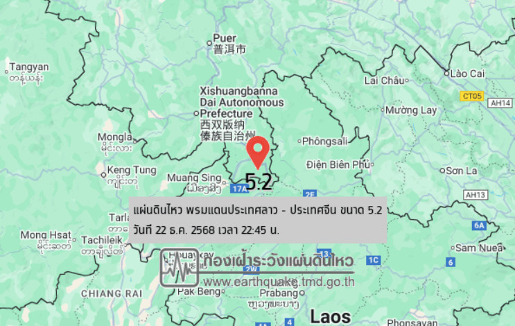 วันที่ 22 ธ.ค. 2568 เวลา 22.45 น. กองเฝ้าระวังแผ่นดินไหว กรมอุตุนิยมวิทยา แจ้งเหตุ แผ่นดินไหว ขนาด 5.2 ความลึก 10 กม. บริเวณพรมแดนประเทศลาว - ประเทศจีน (21.33°N,101.58°E) ศูนย์กลางห่างออกไปทางทิศตะวันออกเฉียงเหนือของ ต.ริมโขง อ.เชียงของ จ.เชียงราย ประมาณ 166 กม. มีรายงานว่า สามารถรับรู้ได้ถึงแรงสั่นสะเทือน ได้ที่อำเภอแม่สาย และอำเภอเวียงเชียงรุ้ง จังหวัดเชียงราย