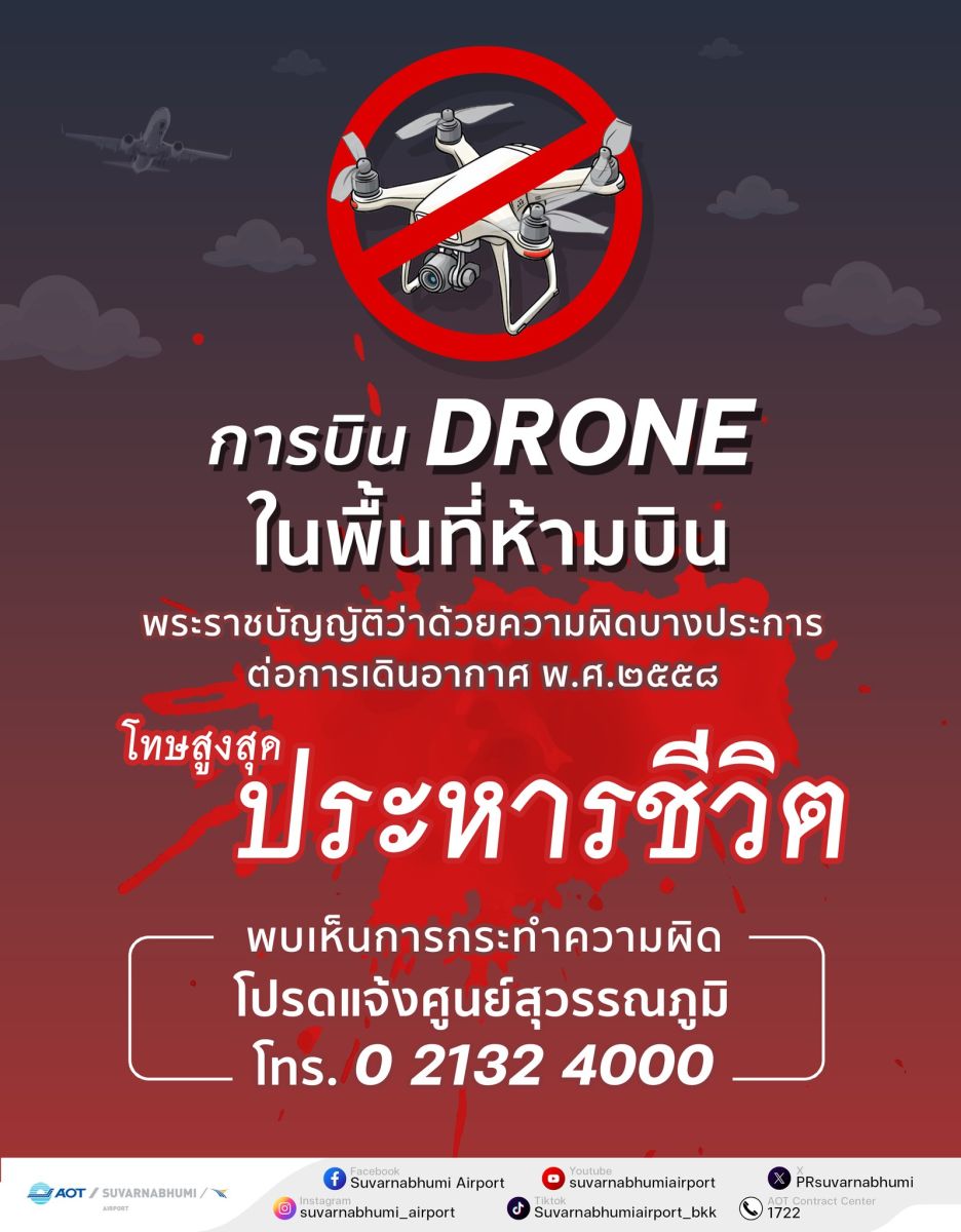 นายกิตติพงศ์ กล่าวเพิ่มเติมว่า การบินอากาศยานไร้คนขับใกล้เขตสนามบินเป็นการกระทำที่ผิดกฎหมายและมีความเสี่ยงสูง โดยเฉพาะในรัศมี 9 กิโลเมตร ผู้ฝ่าฝืนมีโทษตามกฎหมาย โดยหากเข้าข่ายความผิดเกี่ยวกับ พ.ร.บ. ว่าด้วยความผิดบางประการต่อการเดินอากาศ พ.ศ.2558 ผู้ฝ่าฝืนมีโทษหนักถึงขั้นประหารชีวิต พร้อมขอความร่วมมือประชาชน หากพบเห็นสิ่งผิดปกติสามารถแจ้ง ศูนย์สุวรรณภูมิ โทร. 0 2132 4000 ตลอด 24 ชั่วโมง ทสภ. ยืนยันให้ความสำคัญสูงสุดกับความปลอดภัย และมีความพร้อมอย่างเต็มที่ในการดูแลผู้โดยสารและการเดินอากาศ เพื่อสร้างความเชื่อมั่นแก่ประชาชน ผู้ใช้บริการ และสนับสนุนภาพลักษณ์การท่องเที่ยวของประเทศไทยอย่างยั่งยืน