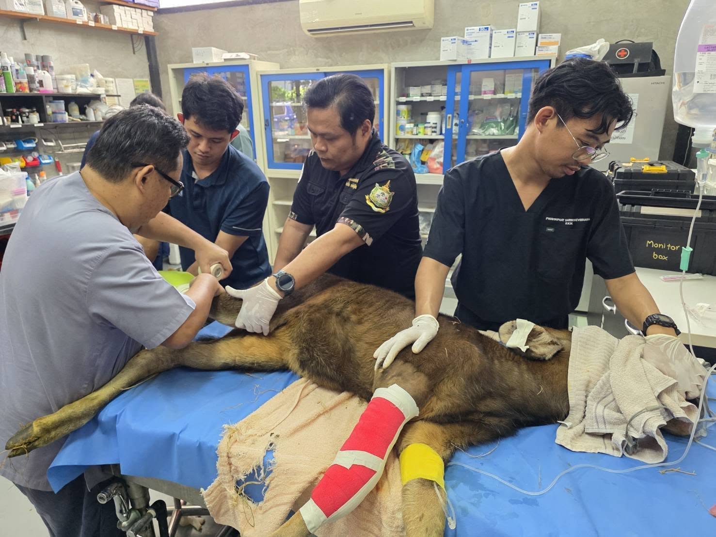 ทีมสัตวแพทย์ผู้ปฏิบัติภารกิจครั้งนี้ ประกอบด้วย นายสัตวแพทย์นราธิป วรวัฒนธรรม สัตวแพทย์ประจำส่วนอนุรักษ์สัตว์ป่า สำนักบริหารพื้นที่อนุรักษ์ที่ 1 (ปราจีนบุรี), นายสัตวแพทย์ปุญญพัฒน์ สารแขวีระกุล สัตวแพทย์ประจำส่วนอนุรักษ์สัตว์ป่า สำนักบริหารพื้นที่อนุรักษ์ที่ 7 (นครราชสีมา), นายสัตวแพทย์วัชรินทร์ หินอ่อน ผู้อำนวยการคลินิกปศุสัตว์และสัตว์ป่า โรงพยาบาลสัตว์ปากช่อง, นายสัตวแพทย์ณฐวุฒิ คณาติยานนท์ ผู้อำนวยการโรงพยาบาลสัตว์เลี้ยงพรีเมียร์ พร้อมทีมเจ้าหน้าที่จากทุกหน่วยงาน