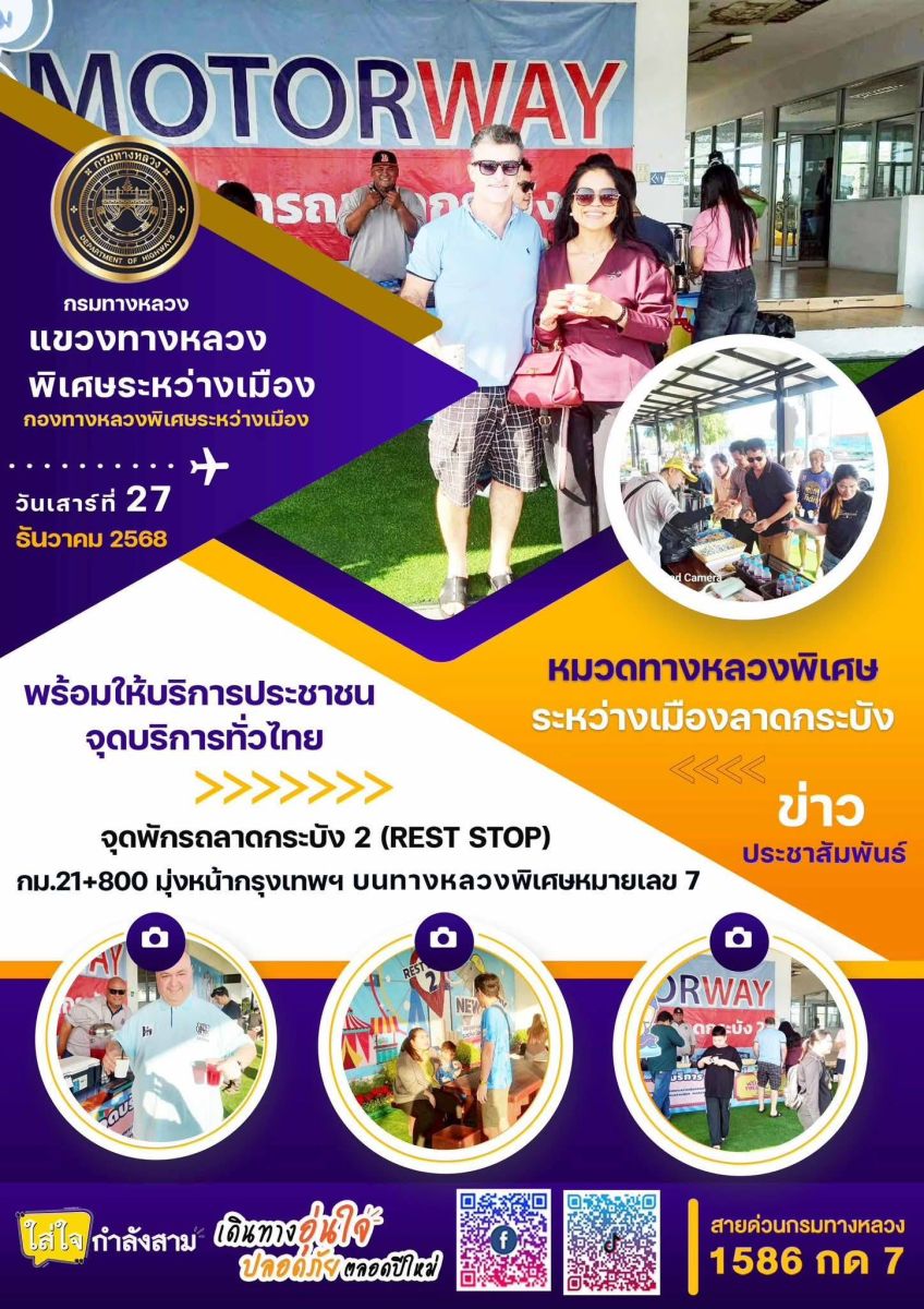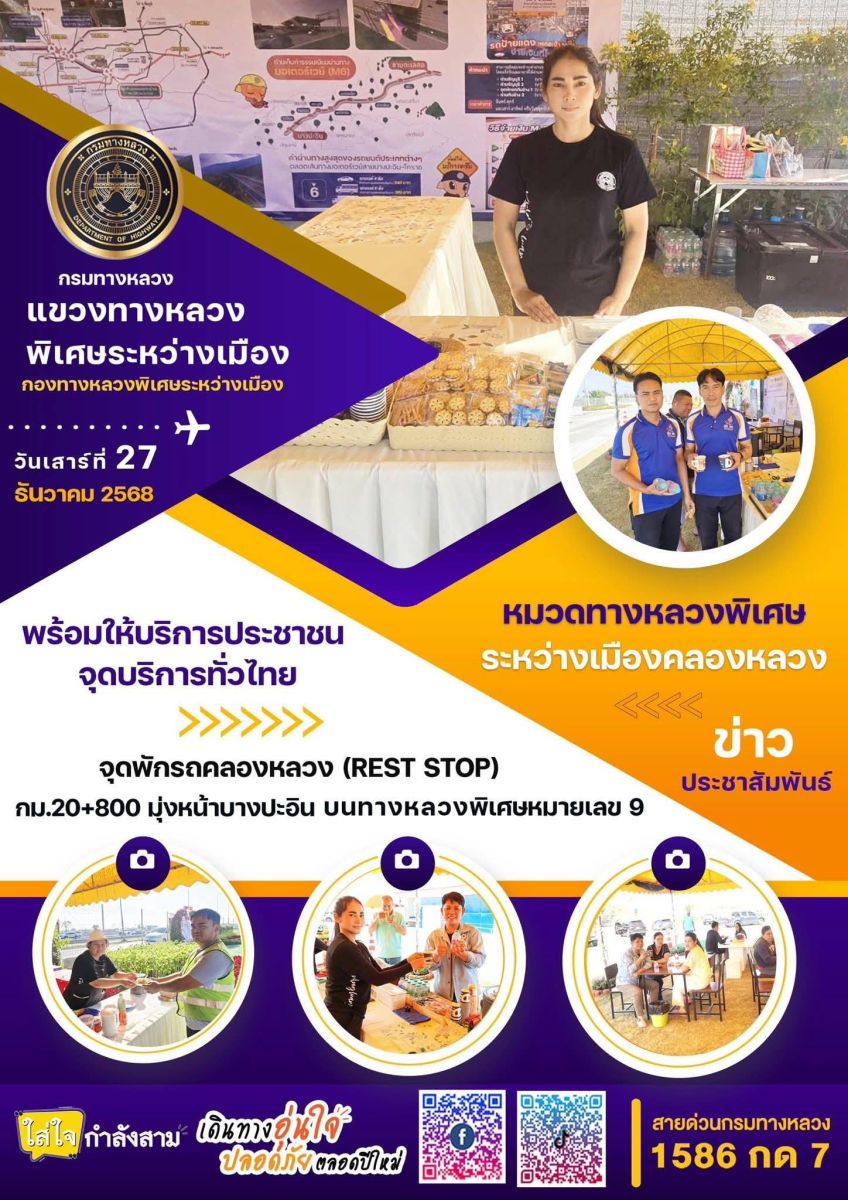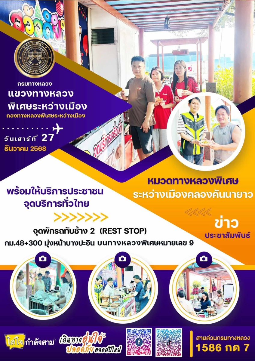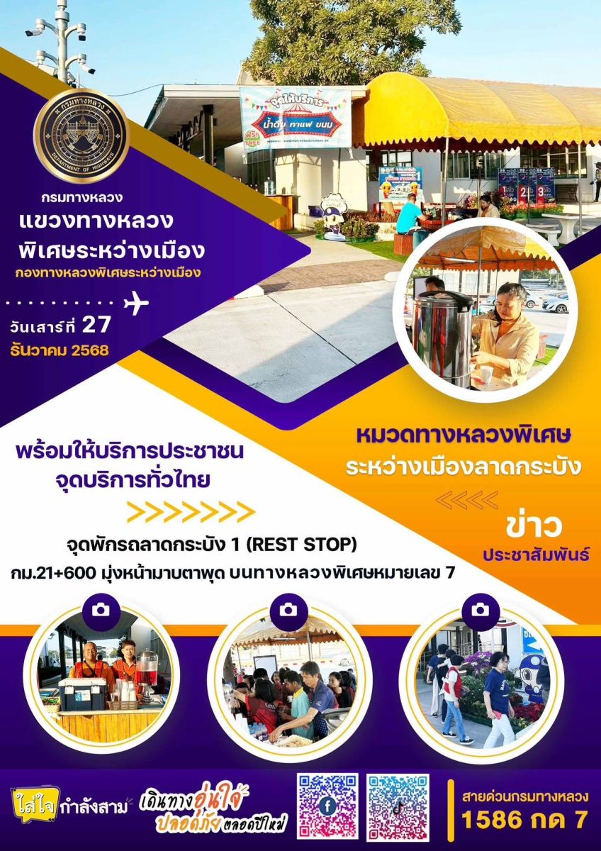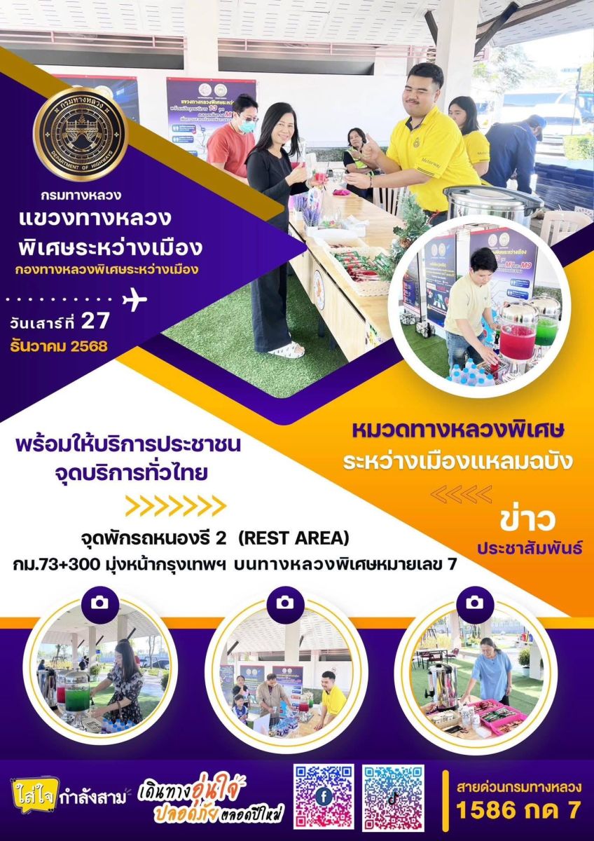 แขวงทางหลวงพิเศษระหว่างเมือง พร้อมให้บริการประชาชน บนทางหลวงพิเศษหมายเลข 7 และ 9 ณ จุดบริการทั่วไทย และจุดบริการห้องน้ำสะอาด โดยให้บริการน้ำดื่ม กาแฟ โอวัลติน ผ้าเย็น และขนมขบเคี้ยวต่างๆ สำหรับประชาชนที่เดินทางกลับภูมิลำเนา และเดินทางท่องเที่ยวในวันหยุดยาวช่วงเทศกาลปีใหม่ 2569 ได้แวะใช้บริการ ผ่อนคลายอิริยาบท ลดความเมื่อยล้าจากการเดินทาง