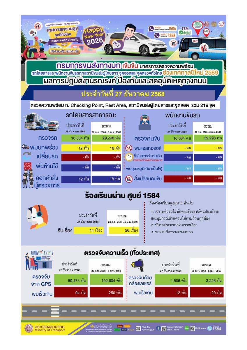สำหรับผลการดำเนินการตรวจความพร้อม ในวันที่ 27 ธันวาคม 2568 ตรวจรถโดยสารสาธารณะจำนวน 16,584 คัน พบรถบกพร่อง 12 คัน ดำเนินการออกคำสั่งผู้ตรวจการแล้วทุกคัน ส่วนการตรวจความพร้อมพนักงานขับรถ จำนวน 16,584 ราย ไม่พบพนักงานขับรถบกพร่อง