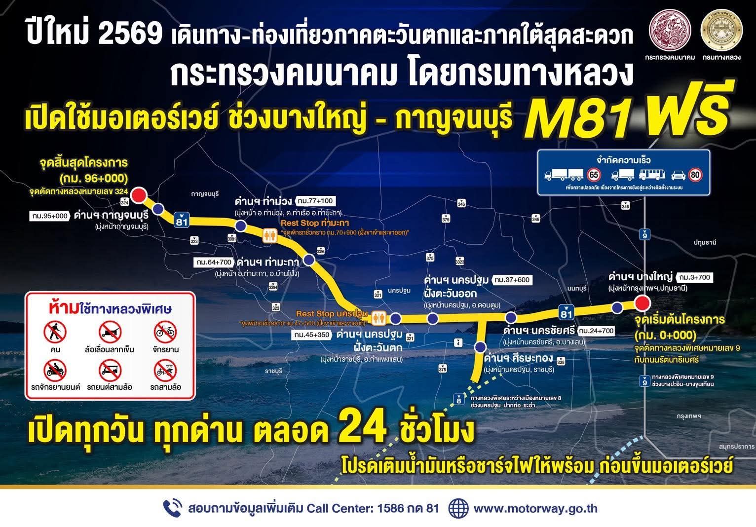 มอเตอร์เวย์ M81 บางใหญ่ - กาญจนบุรี ทดลองเปิดใช้ฟรีทุกวัน! ตลอด 24 ชั่วโมง