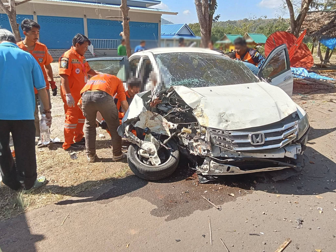 ที่เกิดเหตุ พบรถนั่งส่วนบุคคล ฮอนด้า ซีตี้ สีขาว ลักษณะชนกับต้นไม้ข้างทาง สภาพรถพังเสียหาย พบว่ามีผู้บาดเจ็บทั้งหมด 5 ราย โดยมีติดภายในยานพหานะ 1 ราย อาสาสมัครจึงได้ทำการใช้เครื่องมือตัดถ่างงัดรถ เพื่อนำคนขับออกมาจากรถและปฐมพยาบาลก่อนนำตัวผู้บาดเจ็บทั้งส่ง รพ. สมเด็จพระปิยมหาราชรมณียเขต ในส่วนของสาเหตุที่แท้จริงนั้นอยู่ที่การสอบสวนของเจ้าหน้าที่ตำรวจ สภ.ไทรโยค