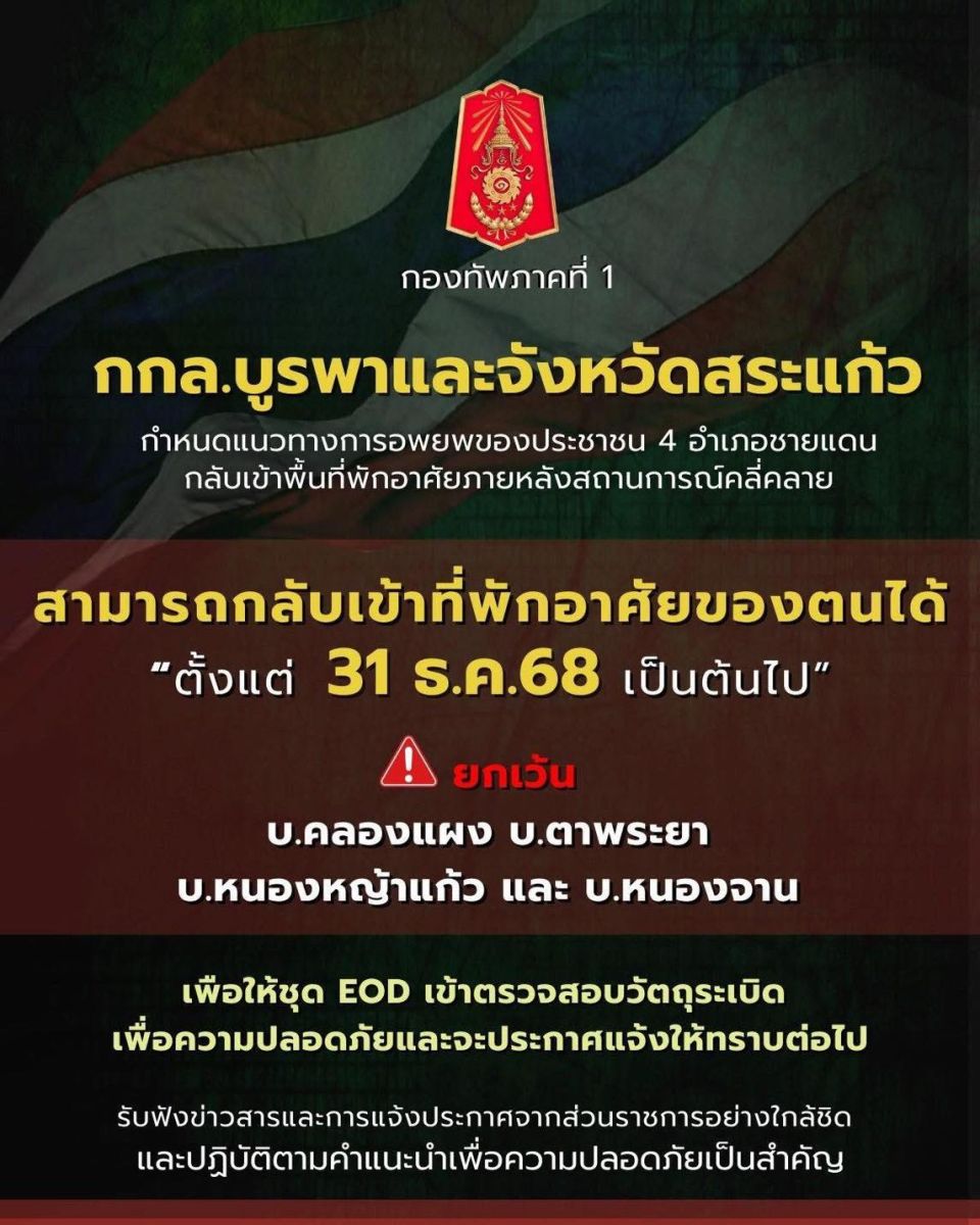 29 ธันวาคม 2568 กกล.บูรพา และ จังหวัดสระแก้ว ได้หารือกำหนดแนวทางการอพยพประชาชน ใน 4 อำเภอ ชายแดน จ.สระแก้ว "สามารถกลับเข้าพื้นที่พักอาศัยของตนได้ ตั้งแต่ 31 ธ.ค.68 เป็นต้นไป ยกเว้น 4 หมู่บ้าน ได้แก่ บ้านคลองแผง, บ้านตาพระยา, บ้านหนองหญ้าแก้ว และบ้านหนองจาน เพื่อให้ชุดเก็บกู้วัตถุระเบิด (EOD) ลงพื้นที่ตรวจสอบและเคลียร์พื้นที่ก่อนประชาชนเดินทางกลับ โดยจะแจ้งให้ทราบห้วงต่อไป