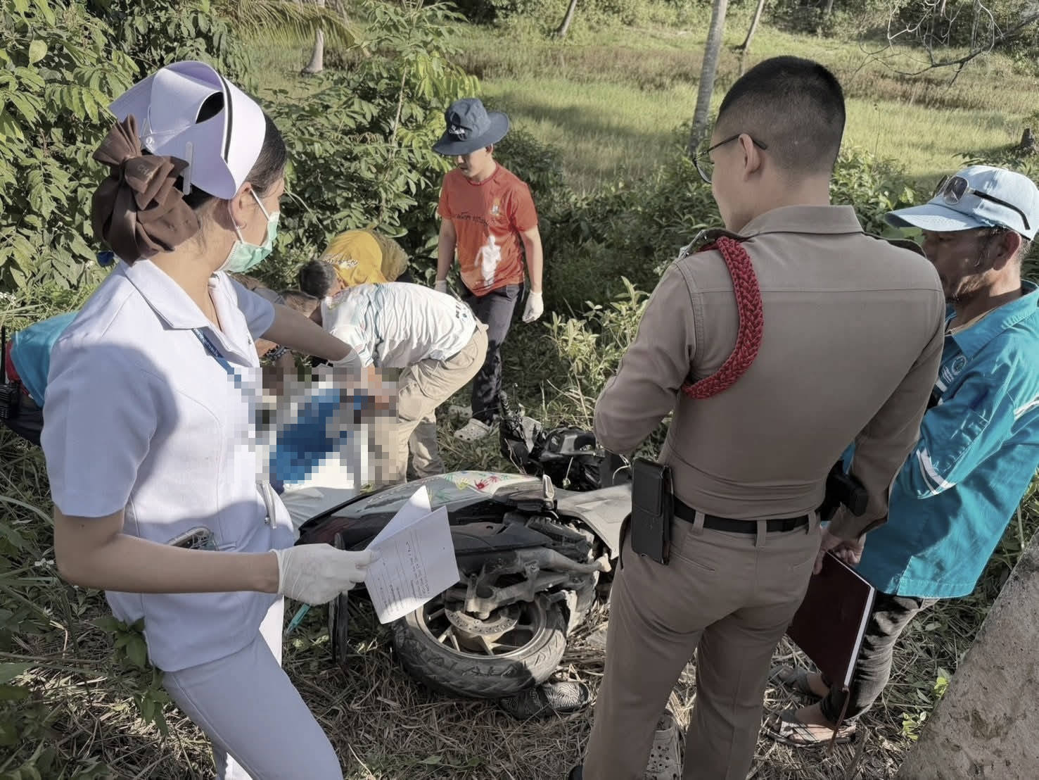 รถจักรยานยนต์ชนเสาไฟฟ้า ริมถนนบนเกาะพงัน มีทั้งผู้บาดเจ็บและเสียชีวิต เป็นหญิงชาวเมียนมา จ.สุราษฎร์ธานี
