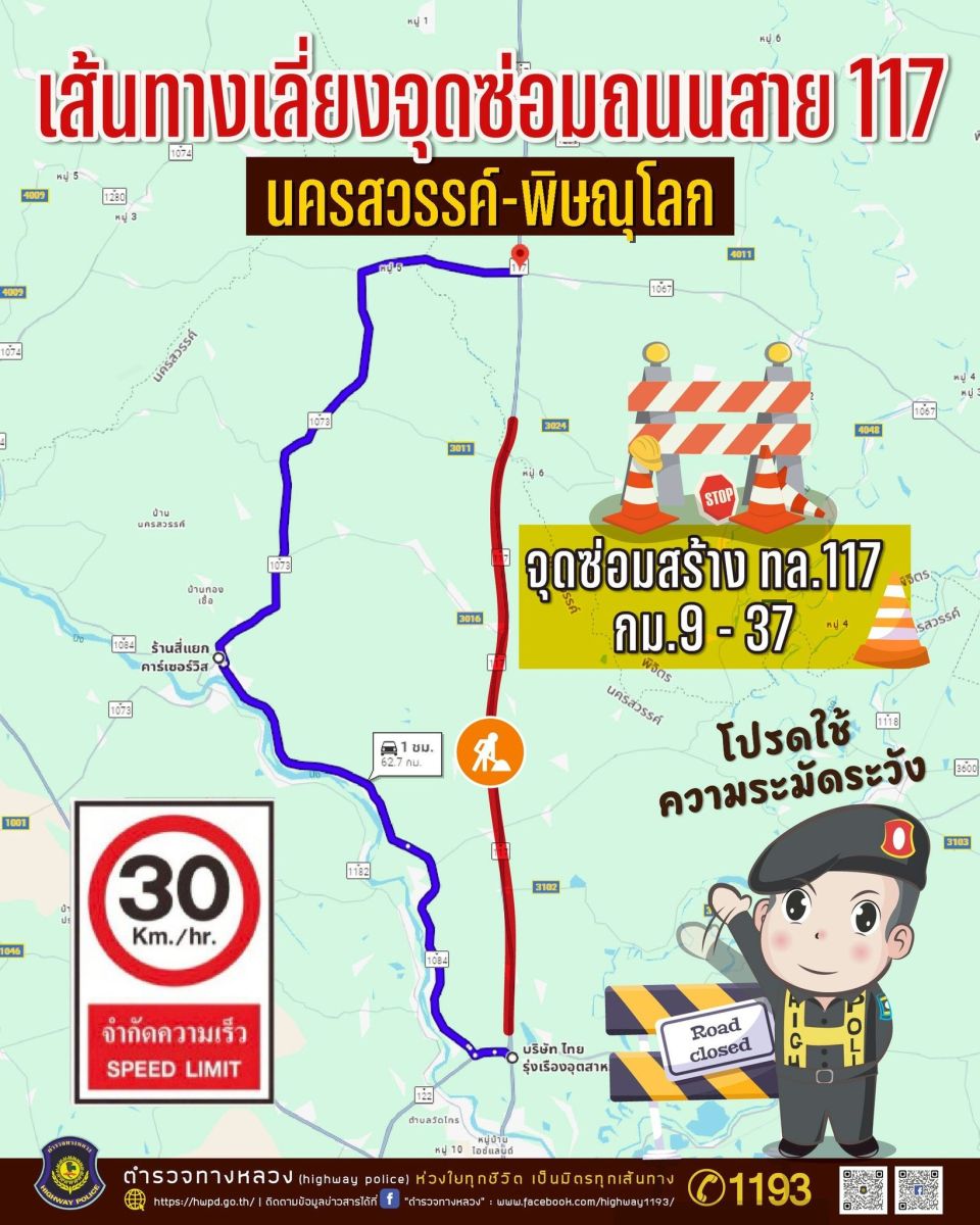 ตำรวจทางหลวงจังหวัดนครสวรรค์ ประชาสัมพันธ์ให้ผู้ใช้เส้นทาง เลี่ยงทางหลวงหมายเลข 117 สายนครสวรรค์–พิษณุโลก เนื่องจากมีการซ่อมแซมผิวจราจรในช่วงหลักกิโลเมตรที่ 9 ถึงกิโลเมตรที่ 37 รวมระยะทางประมาณ 28 กิโลเมตร ส่งผลให้ต้องลดช่องจราจรเหลือเพียง 2 เลน และใช้การสัญจรแบบสวนทาง ทำให้การจราจรชะลอตัว และเพิ่มความเสี่ยงต่อการเกิดอุบัติเหตุ โดยเฉพาะในช่วงการเดินทางเทศกาลปีใหม่