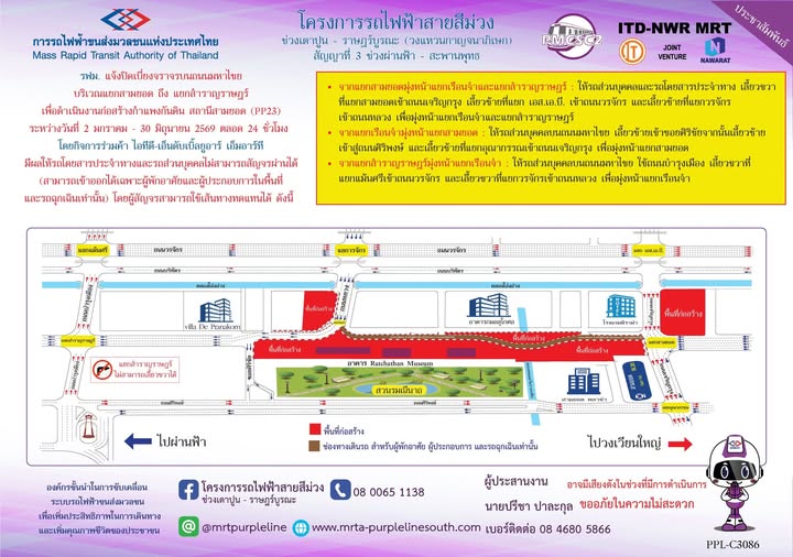การรถไฟฟ้าขนส่งมวลชนแห่งประเทศไทย (รฟม.) แจ้งว่า กิจการร่วมค้า ไอทีดี-เอ็นดับเบิ้ลยูอาร์ เอ็มอาร์ที ผู้รับจ้างงานออกแบบและก่อสร้างอุโมงค์ทางวิ่งและสถานีใต้ดิน โครงการรถไฟฟ้าสายสีม่วง ช่วงเตาปูน - ราษฎร์บูรณะ (วงแหวนกาญจนาภิเษก) สัญญาที่ 3 ช่วงผ่านฟ้า - สะพานพุทธ มีความจำเป็นต้องเปลี่ยนการเดินรถบนถนนมหาไชย บริเวณแยกสามยอด ถึง แยกสำราญราษฎร์ เพื่อดำเนินงานก่อสร้างกำแพงกันดิน สถานีสามยอด ระหว่างวันที่ 2 มกราคม - 30 มิถุนายน 2569 ตลอด 24 ชั่วโมง มีผลให้รถโดยสารประจำทางและรถส่วนบุคคลไม่สามารถสัญจรผ่านได้ (สามารถเข้า-ออกได้เฉพาะผู้พักอาศัยและผู้ประกอบการในพื้นที่และรถฉุกเฉินเท่านั้น) โดยผู้สัญจรสามารถใช้เส้นทางทดแทนได้ ดังนี้