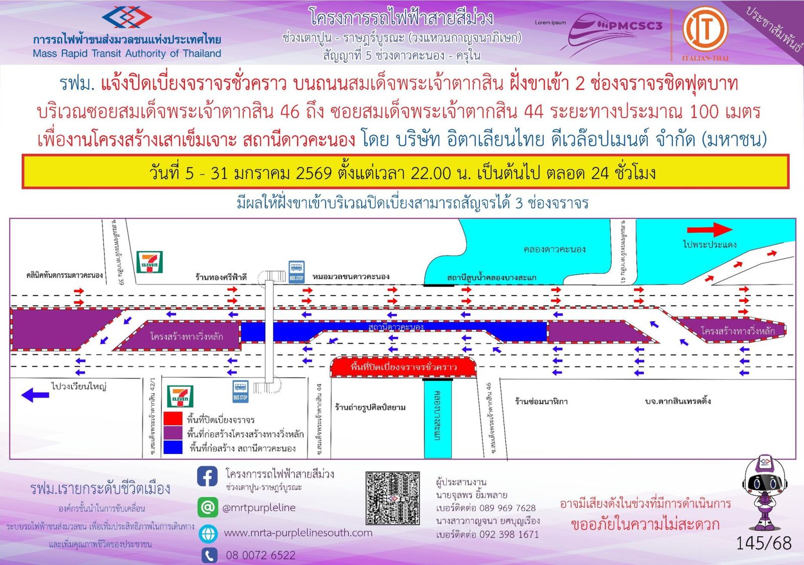 การรถไฟฟ้าขนส่งมวลชนแห่งประเทศไทย (รฟม.) แจ้งว่า บริษัท อิตาเลียนไทย ดีเวล๊อปเมนต์ จำกัด (มหาชน) ผู้รับจ้างงานก่อสร้างทางวิ่งและสถานียกระดับ อาคารจอดรถไฟฟ้าและอาคารจอดแล้วจร โครงการรถไฟฟ้าสายสีม่วง ช่วงเตาปูน - ราษฎร์บูรณะ (วงแหวนกาญจนาภิเษก) สัญญาที่ 5 ช่วงดาวคะนอง - ครุใน มีความจำเป็นต้องปิดเบี่ยงจราจรชั่วคราว บนถนนสมเด็จพระเจ้าตากสิน ฝั่งขาเข้า 2 ช่องจราจร ชิดฟุตบาท บริเวณซอยสมเด็จพระเจ้าตากสิน 46 ถึง ซอยสมเด็จพระเจ้าตากสิน 44 ระยะทางประมาณ 100 เมตร เพื่องานโครงสร้างเสาเข็มเจาะ สถานีดาวคะนอง ในวันที่ 5 - 31 มกราคม 2569 ตั้งแต่เวลา 22.00 น. เป็นต้นไป ตลอด 24 ชั่วโมง โดยมีผลให้ถนนสมเด็จพระเจ้าตากสินฝั่งขาเข้า บริเวณปิดเบี่ยงสามารถสัญจรได้ 3 ช่องจราจร