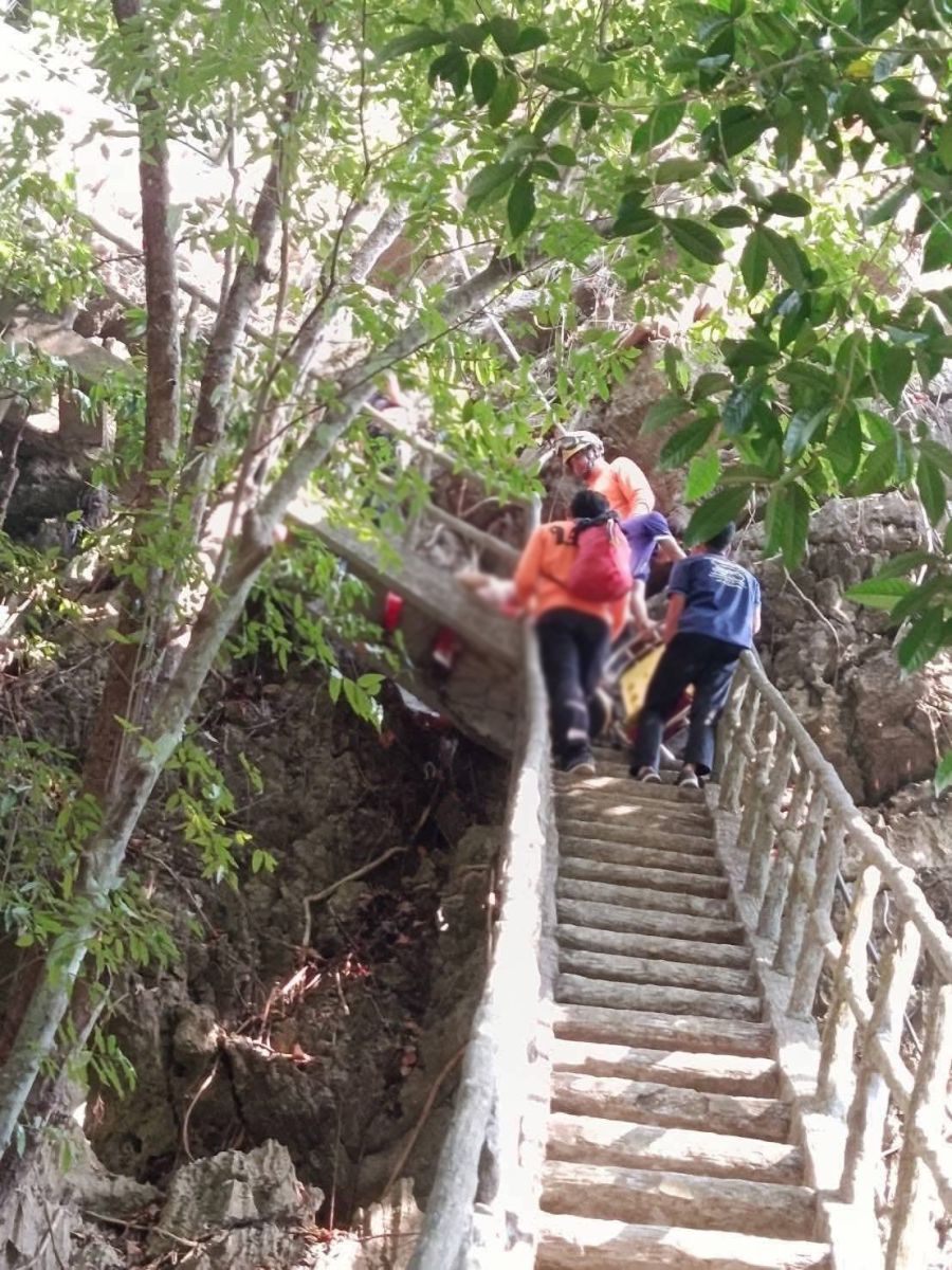 ต่อมา เจ้าหน้าที่ได้ใช้อุปกรณ์กู้ภัยนำร่างผู้เสียชีวิตลงจากจุดเกิดเหตุอย่างทุลักทุเล ก่อนส่งร่างไปยังโรงพยาบาลพังงา เพื่อให้แพทย์ดำเนินการชันสูตรพลิกศพตามขั้นตอนทางกฎหมาย โดยสาเหตุการเสียชีวิตอยู่ระหว่างการตรวจสอบของเจ้าหน้าที่ที่เกี่ยวข้อง เบื้องต้นนั้นคาดว่านักท่องเที่ยวได้ปีนบันไดขึ้นไปยังเจดีย์ที่อยู่บนภูเขา ซึ่งบันไดแคบและชัน คาดว่าขณะขึ้นไปอากาศร้อนจนวูบหมดสติจนเสียชีวิตดังกล่าว