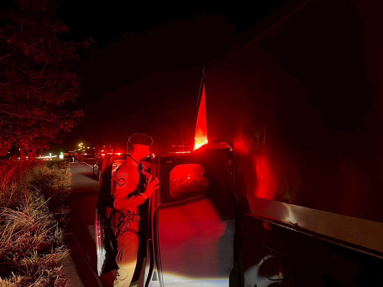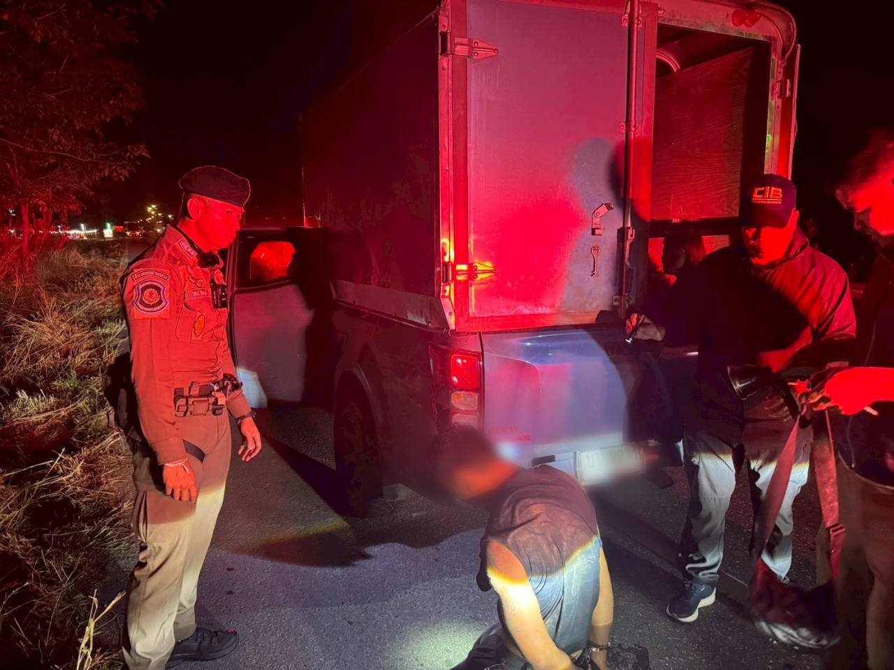 เจ้าหน้าที่ให้สัญญาณหยุดรถเพื่อตรวจสอบ แต่คนขับกลับเร่งเครื่องหลบหนี ก่อนทิ้งรถแล้ววิ่งหนีเข้าไปในป่าละเมาะและทุ่งนาข้างทาง ท่ามกลางความมืด จึงกระจายกำลังติดตาม จนพบผู้ต้องหาซ่อนตัวอยู่ในเพิงพักสังกะสีใกล้จุดเกิดเหตุและควบคุมตัวไว้ได้