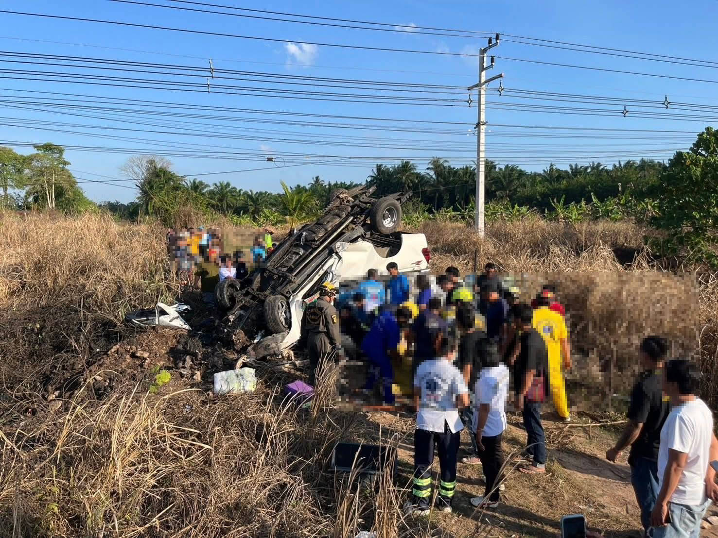 ที่เกิดเหตุ พบรถกระบะ สีขาว บรรทุกผักสด ลักษณะพลิกหงายท้องอยู่ข้างทาง สภาพรถเสียหายทั้งคัน ทางหน่วยกู้ภัยสายชลชุมพร ร่วมกับหน่วยกู้ชีพกู้ภัยในพื้นที่ พร้อมอุปกรณ์ตัด-ถ่าง เข้าดำเนินการช่วยเหลือผู้บาดเจ็บ สามารถนำผู้บาดเจ็บซึ่งเป็นผู้โดยสารออกจากตัวรถได้อย่างปลอดภัย ผู้บาดเจ็บเป็น เพศชาย 1 ราย และเพศหญิง 1 ราย อายุประมาณ 25–35 ปี และมอบให้รถกู้ชีพโรงพยาบาลท่าแซะ รับผู้บาดเจ็บทั้ง 2 ราย นำส่งโรงพยาบาลเพื่อรับการรักษาอย่างเร่งด่วน พื้นที่ สภ.ท่าแซะ