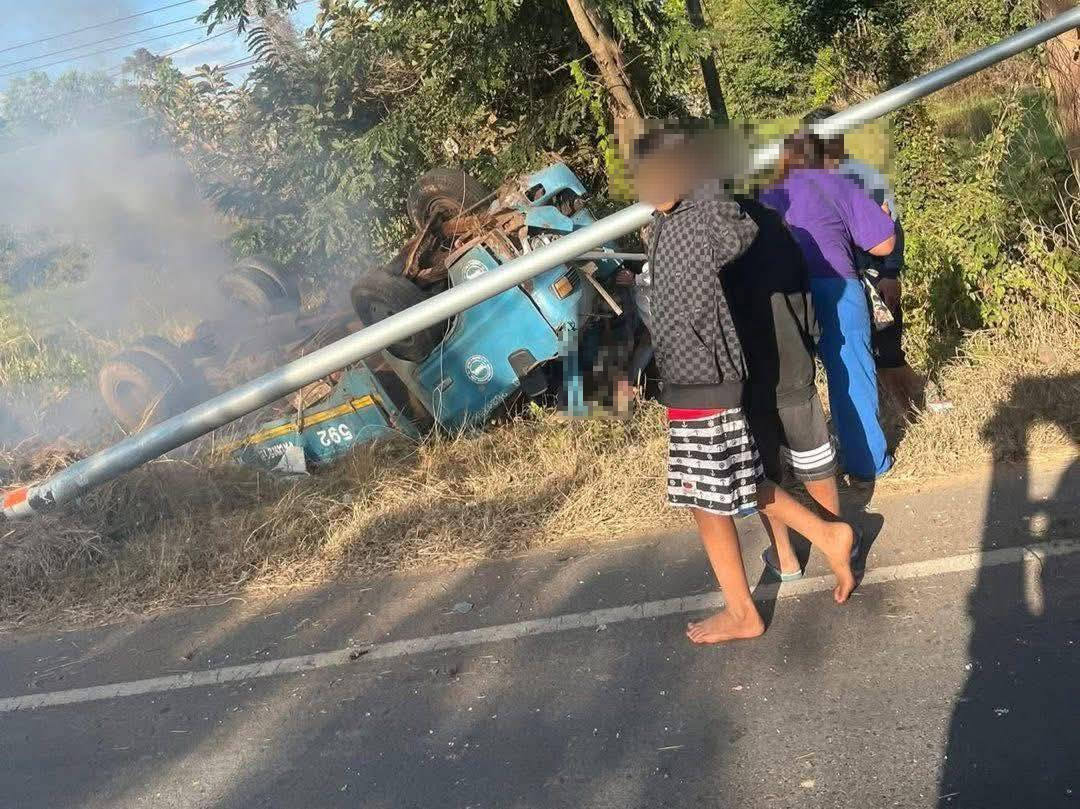รถ 6 ล้อโดยสารรับส่งนักเรียน เสียหลักพลิกคว่ำลงข้างทาง นักเรียนเจ็บระนาว จ.ร้อยเอ็ด