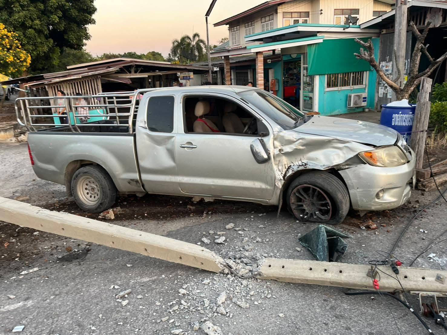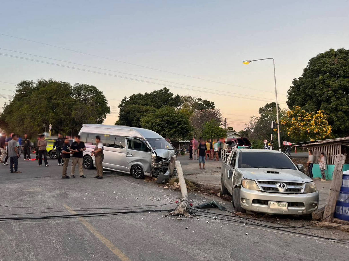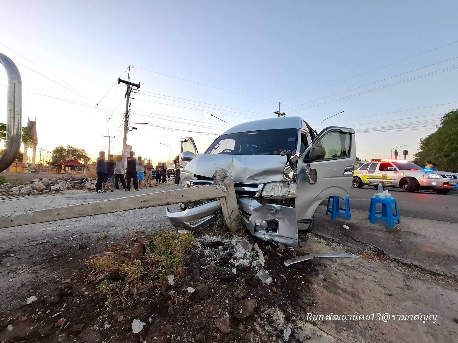ที่เกิดเหตุ พบรถตู้ โตโยต้า สีเทา ลักษณะชนกับเสาไฟข้างทาง สภาพหน้ารถพังเสียหาย และใกล้กันพบรถกระบะ โตโยต้า สีทอง สภาพข้างรถฝั่งขวา มีร่องรอยการชนได้รับความเสียหาย ตรวจสอบพบว่ามีผู้ได้รับบาดเจ็บ 3 ราย เป็นหญิง 1 รายและชาย 1 ราย ทางอาสาสมัครให้การช่วยเหลือและนำส่ง รพ.ใกล้เคียง