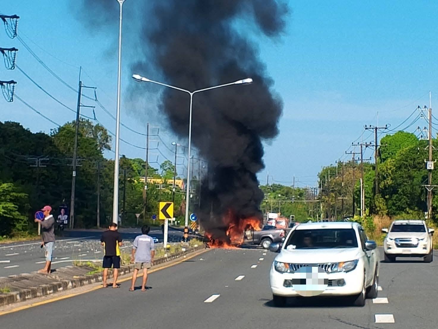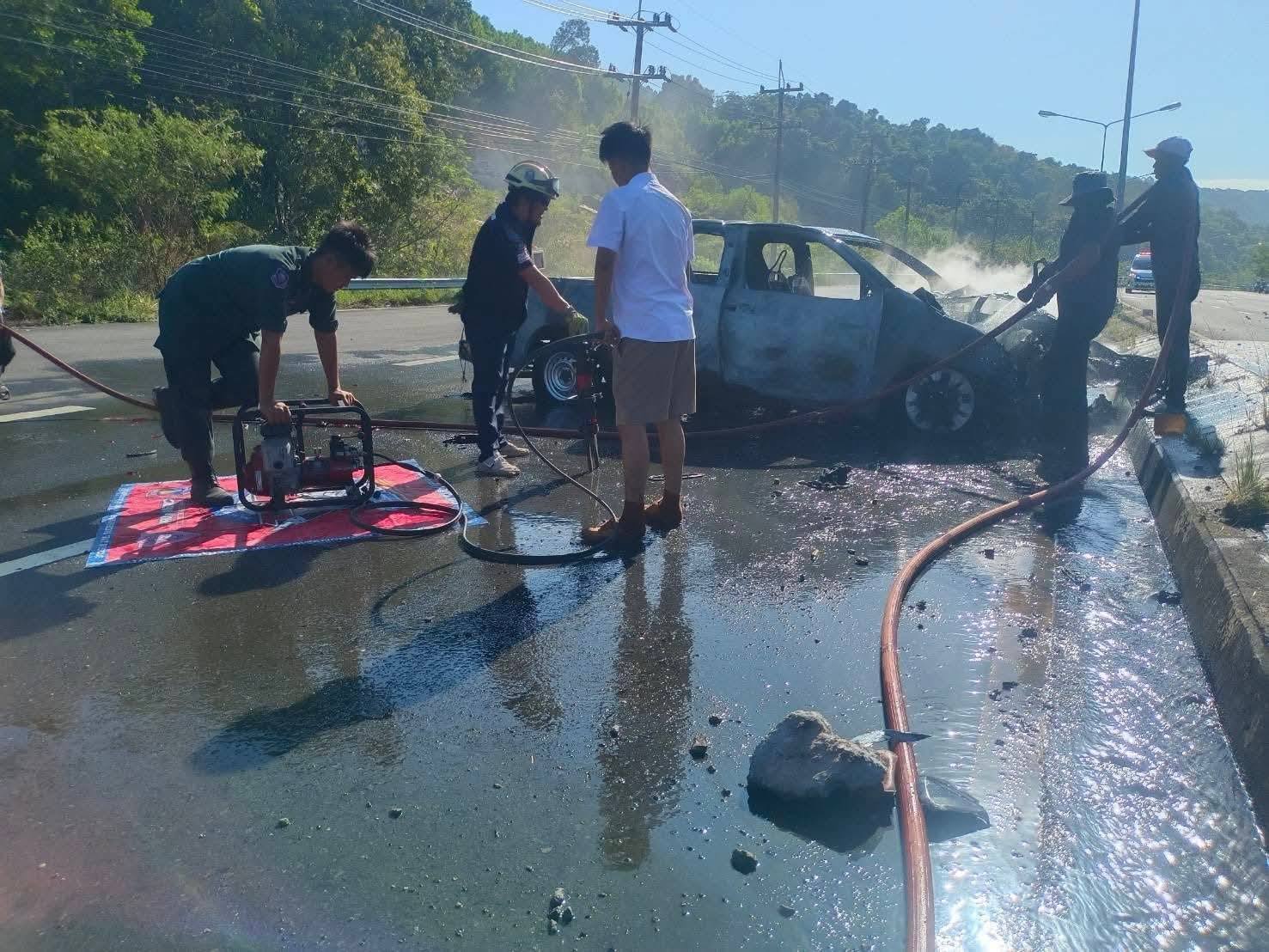 จ.ตราด รถกระบะเสียหลักชนเสาเกาะกลาง แล้วเกิดเพลิงลุกไหม้วอดทั้งคัน คนขับบาดเจ็บ อาสากู้ภัยนำส่ง รพ.