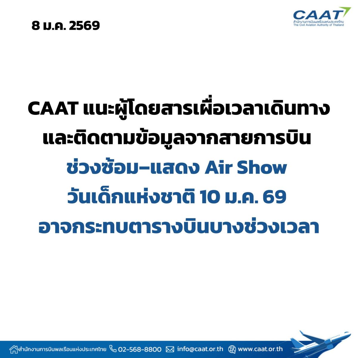 CAAT (สำนักงานการบินพลเรือนแห่งประเทศไทย) แนะผู้โดยสาร เผื่อเวลาเดินทาง ติดตามข้อมูลจากสายการบินช่วงซ้อม–แสดง Air Show วันเด็กแห่งชาติ อาจกระทบตารางบินบางช่วงเวลา